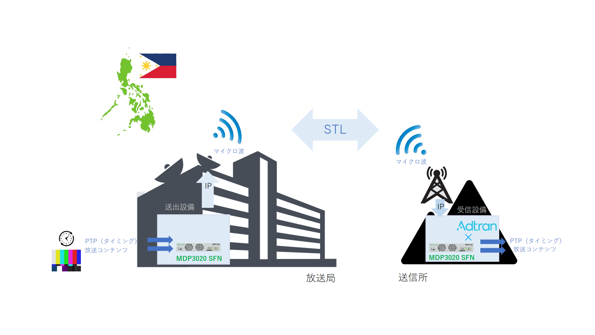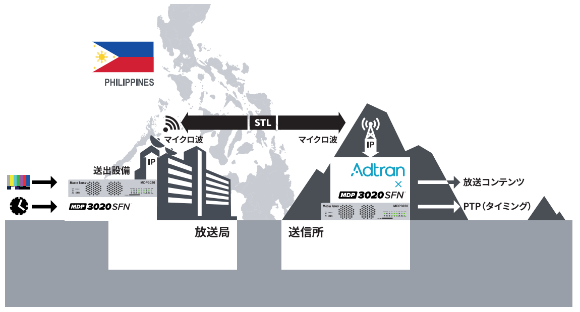 この実証実験は2024年5月13日から17日の期間、フィリピンの放送局で行い、メディアリンクスのSTL over IP/PTP 装置であるMDP3020 SFNを放送コンテンツおよびPTPの伝送に用い、マイクロ波の送受信にはその放送局が現在実放送で運用している設備を使用しました。結果として、放送コンテンツの伝送の正常性と、PTPによるタイミングの正確な伝送を確認し、世界で初めてマイクロ波回線上でIP/PTPによるSTL伝送の実現に成功しました。