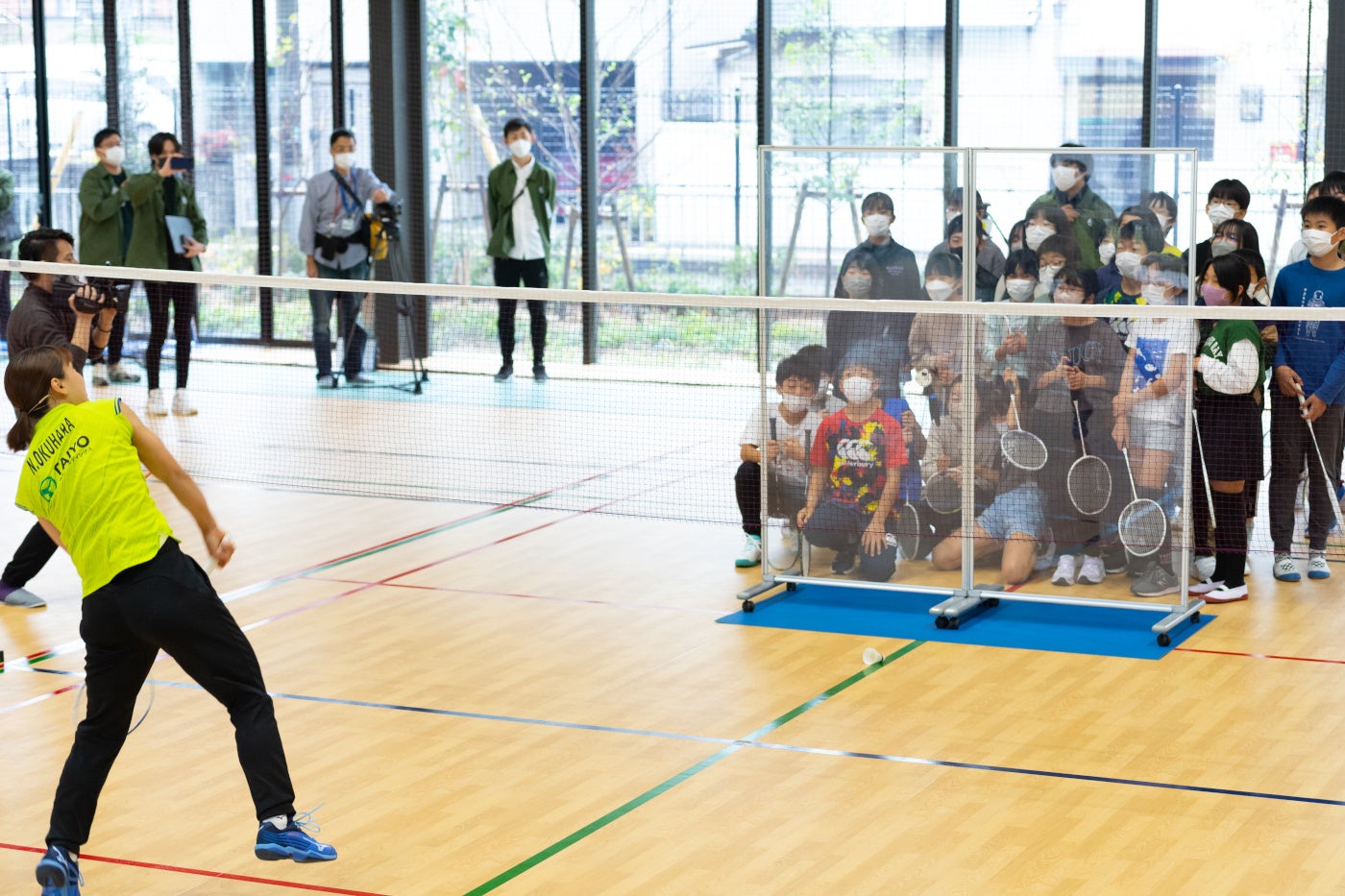 バドミントン教室では、奥原選手によるフォームの指導や参加者の小学生たちとのラリーなどに加え、アクリル板越しに奥原選手のスマッシュを体感する迫力満点の実演が行われました。参加した小学生たちは、「楽しかった、オリンピック選手のすごさがわかった」と、とても楽しそうに語っていました。終了後、奥原選手は「参加者のみんなの上達が思った以上に早く、驚いた。これを機にバドミントンにさらに興味を持ってくれたらうれしい」とコメントされていました。