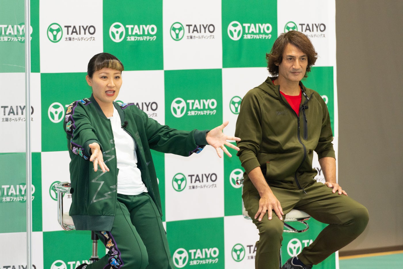 チョコレートプラネットのお二人は、高槻市の“T”と太陽ホールディングスグループの“T”にかけて「TT兄弟」を披露しながら登場し、会場の空気を盛り上げました。また、「避難場所でもできるストレッチは?」という質問に対し奥原選手が「両手を上に伸ばし大きく伸びをすること」と答えた際には、長田さんが腕をおろす途中にも“T”があることを見つけ、会場をどっと沸かせました。