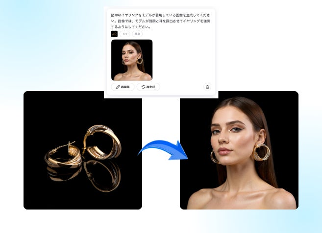 モデル画像生成:商品を着用したモデルの画像を生成し、商品の実際の使用感を顧客に伝えます。 顧客は、商品が実際にどのように見え、どのように使用されるかを具体的に想像できます。特にファッションアイテムやアクセサリーの場合、商品の魅力をより強く印象づけ、購入を促す効果があります。