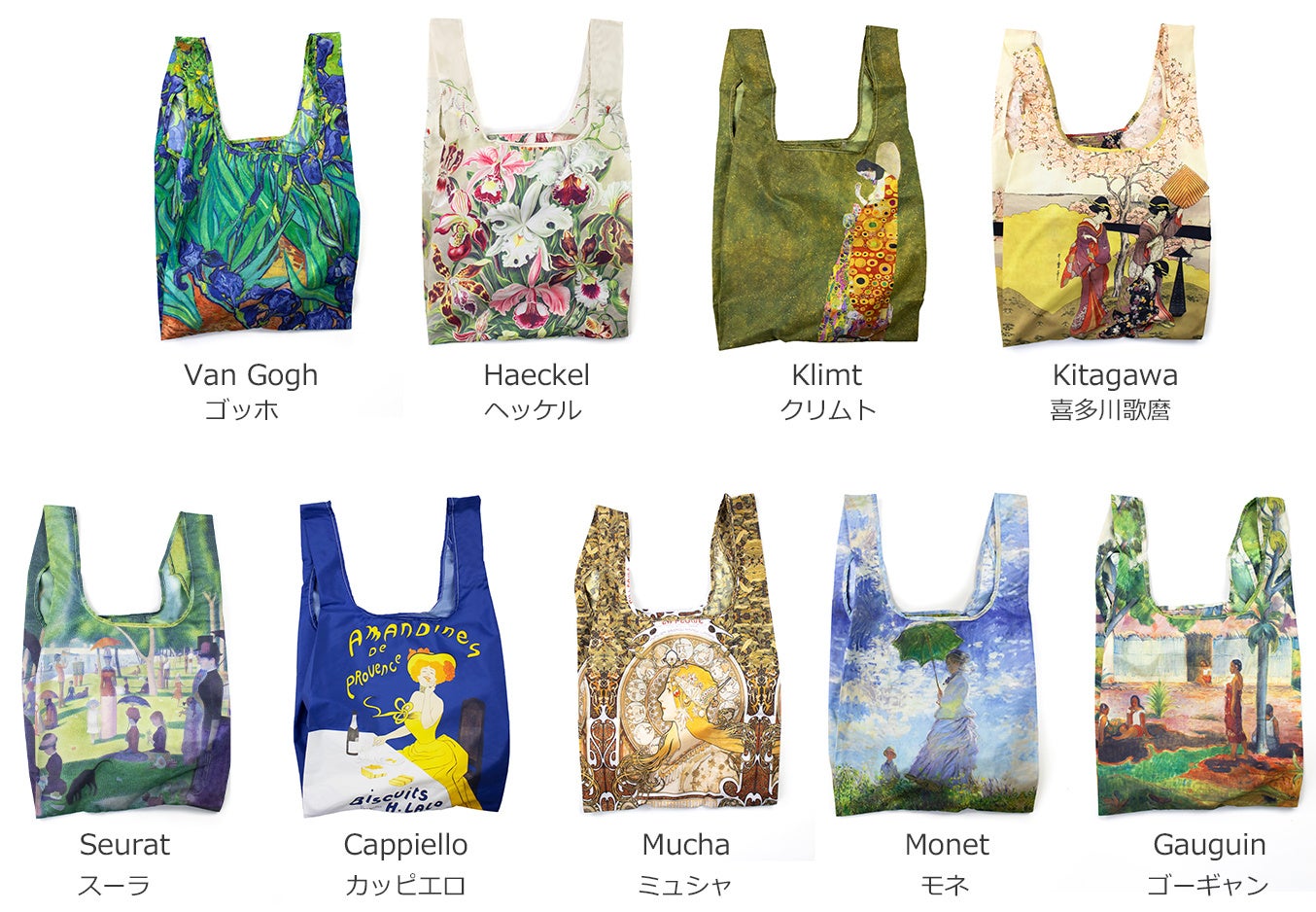 ゴッホの「アイリス」やモネの「散歩、日傘をさす女」など世界の様々な国のアート作品が、毎日使えるエコバッグになりました。誰もが知っている有名画家から、ヘッケルやカッピエロのようなあまり知られていないアーティストまでバリエーション豊かなラインナップが揃っています。
