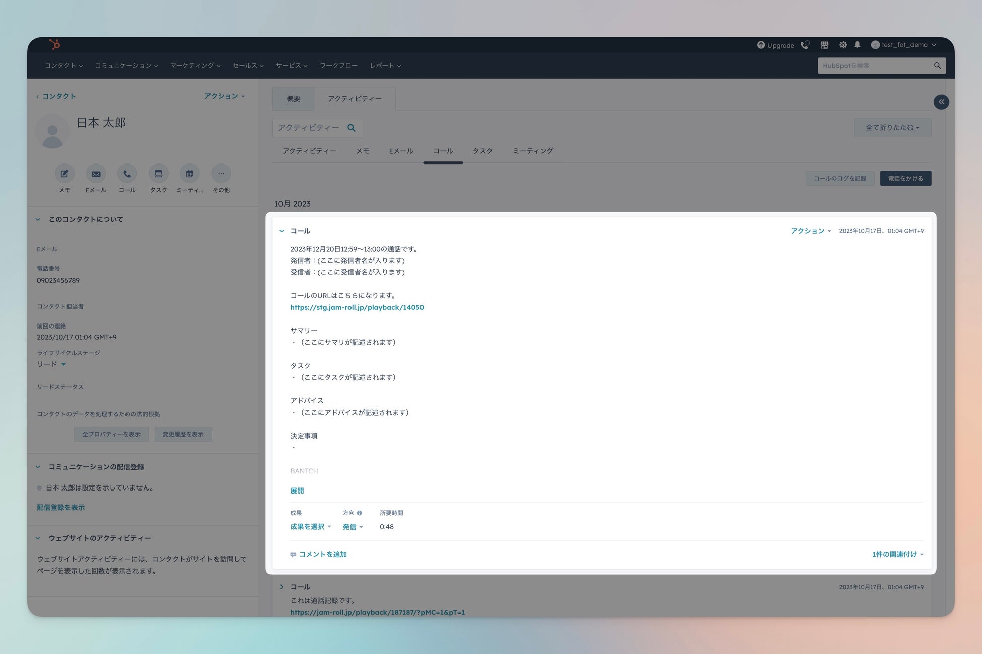 通話終了後、コンタクトの通話先に該当するコンタクトレコードにコールアクティビティを自動で作成し、作成された「コール」には、通話情報、サマリ、タスク、アドバイス、BANTCH情報が書き込まれます。