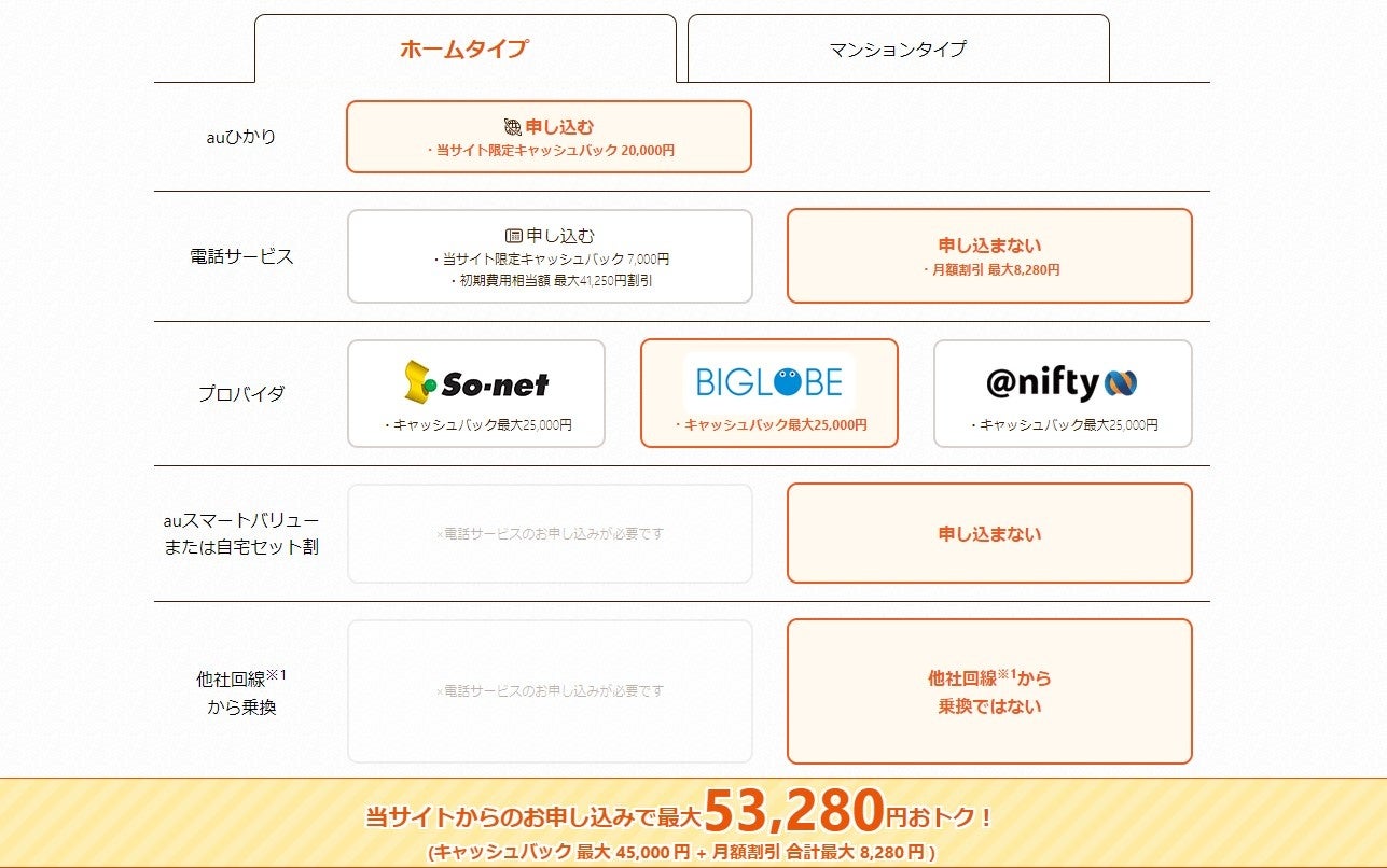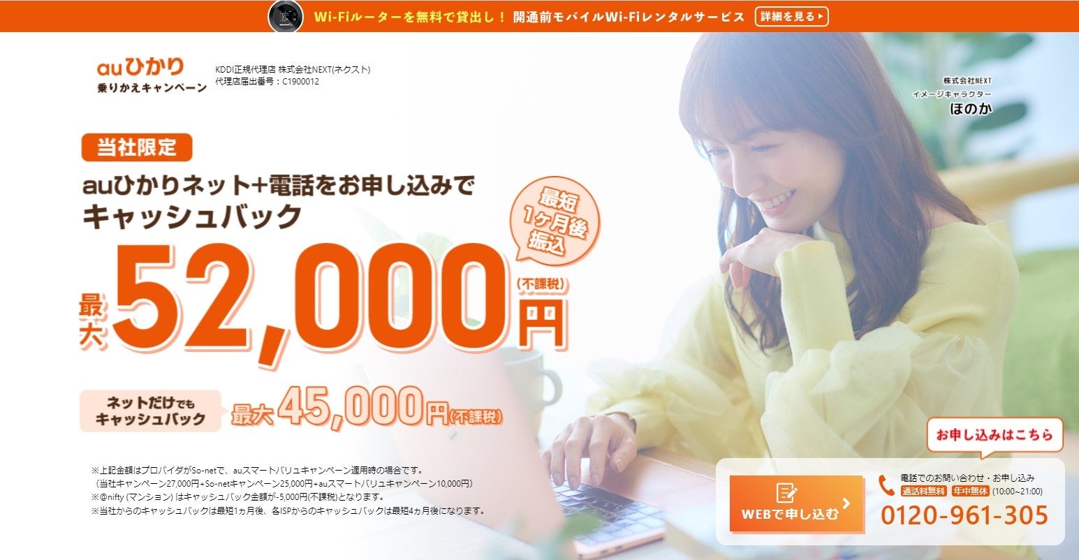 当サイトからお申し込みいただきますと、最大52,000円の高額キャッシュバックを進呈します!さらにKDDI、プロバイダ会社のキャンペーンも併用できるのでさらにお得になります!