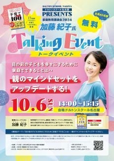 幼児・児童教育を行う河合塾グループのドルトンスクール名古屋校は、2024年の新校舎リニューアル開校を記念し、1才児~小学3年生までのお子様の保護者を対象にしたトークイベントを10月6日(日)に開催します。