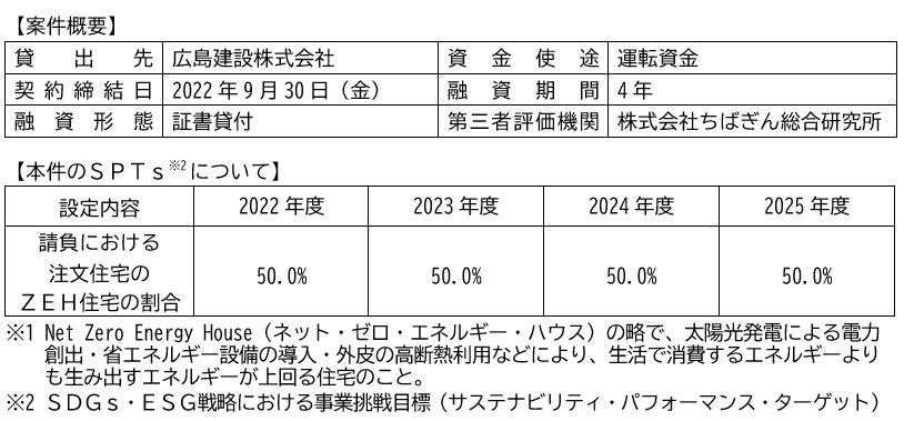 千葉銀行(頭取 米本 努)は、2022年9月30日(金)、広島建設株式会社(代表取締役 島田 秀貴、本社:千葉県柏市)に対して、「ちばぎんSDGsリーダーズローン(サステナビリティ・リンク・ローン型)」を取り組みましたのでお知らせします。
