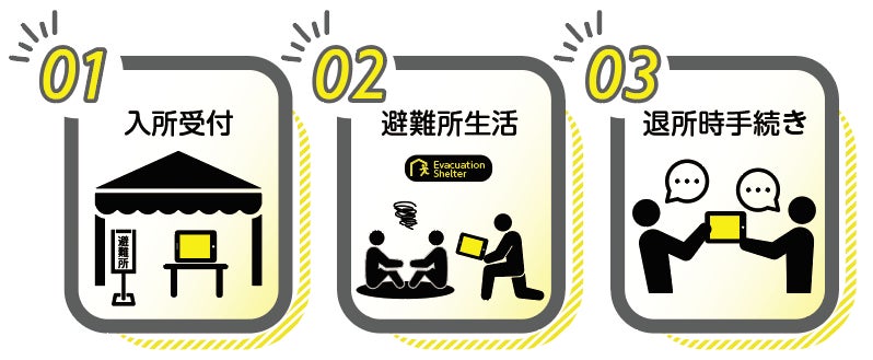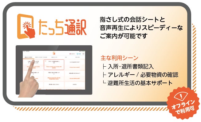 災害発生時においては通信が混雑するケースや、通信インフラがダウンする可能性も想定されます。「たっち通訳」では全ての操作をオフライン(インターネットに繋がっていない状態)で利用でき、避難所の入所受付から入所中の生活支援や退所手続きなどの主要なコミュニケーションをサポートすることが可能です。