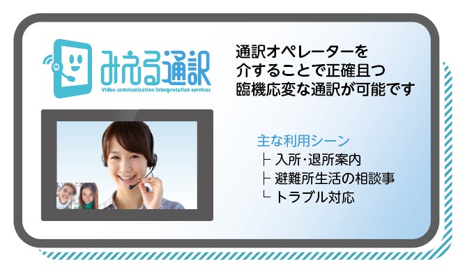 「みえる通訳 避難所支援プラン」は、災害時、避難場所での多言語対応を目的として、リアルタイムの映像通訳「みえる通訳」と、オフラインでも使える指差し会話シート「たっち通訳」を提供しています。