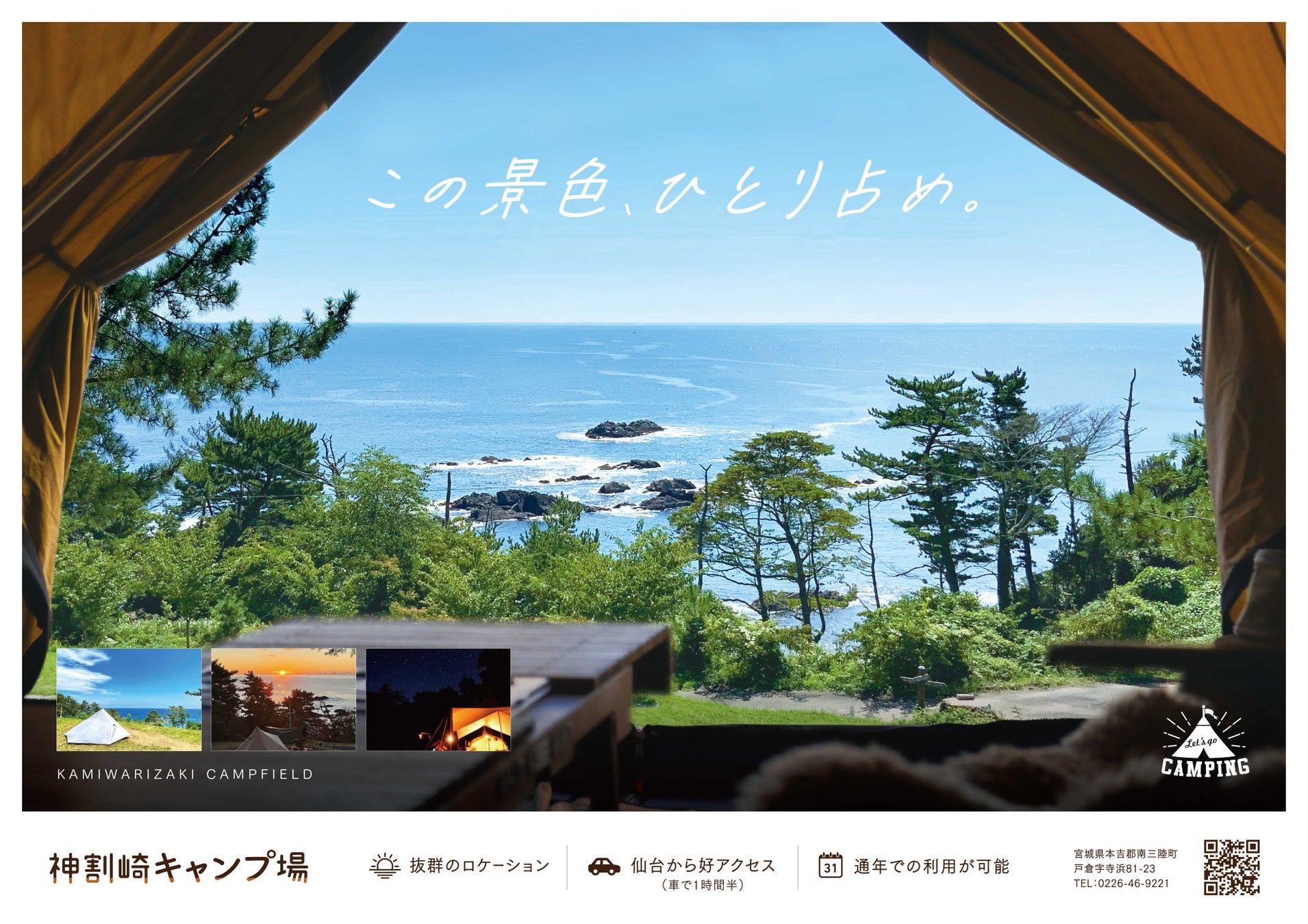 宮城県南三陸町にある神割崎キャンプ場は、町内でも屈指の景勝地「神割崎」に隣接しています。美しい日の出、清々しい青の海と空、満点の星空など、美しい自然に囲まれた雄大なキャンプ場です。