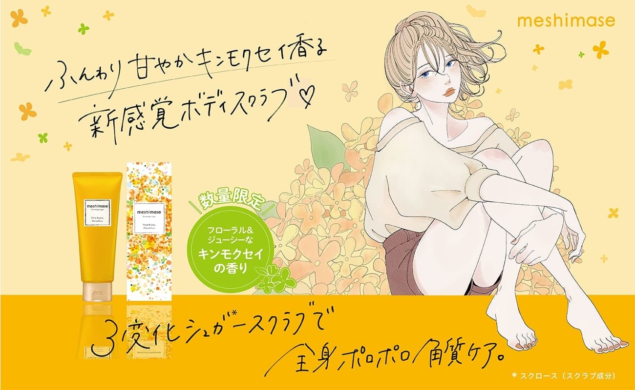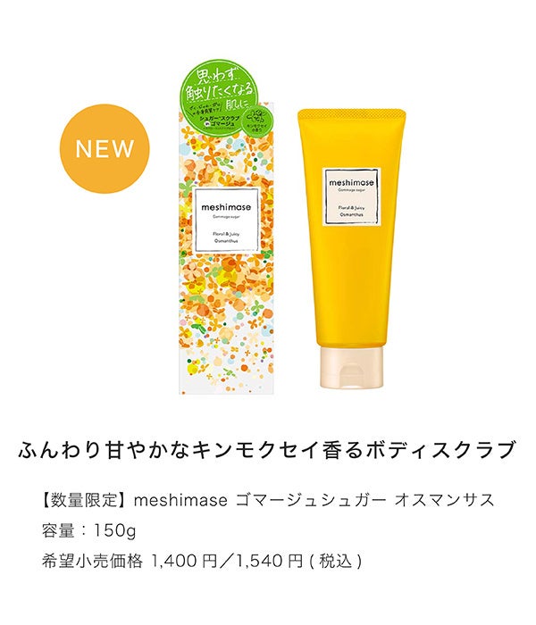 2022年9月7日(水)、やわらかジューシーなツヤ肌で毎日召しませボディを叶える『meshimase』から、数量限定で「meshimase ゴマージュシュガー オスマンサス」が新発売!