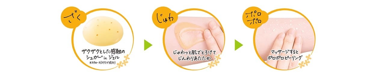 ざく・じゅわ・ポロポロとテクスチャーが3変化!ザクザクしたシュガー*1スクラブinジェルが肌の上でじゅわっととろけて、じんわり温かくなり、マッサージするとポロポロが古い角質をからめとります。
