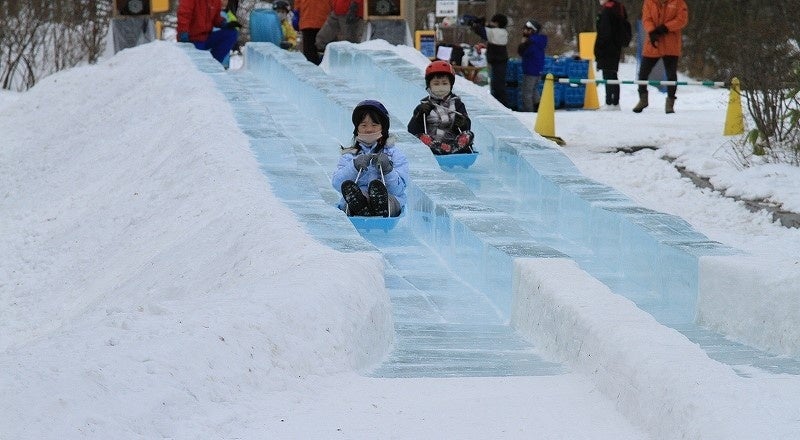 雪と氷で作られた全長50mのロング滑り台「アイススライダー」や、雪の中に隠された宝を探す「雪中宝探し」などなど…冬のあづみの公園には楽しい「寒さ」が待っている!