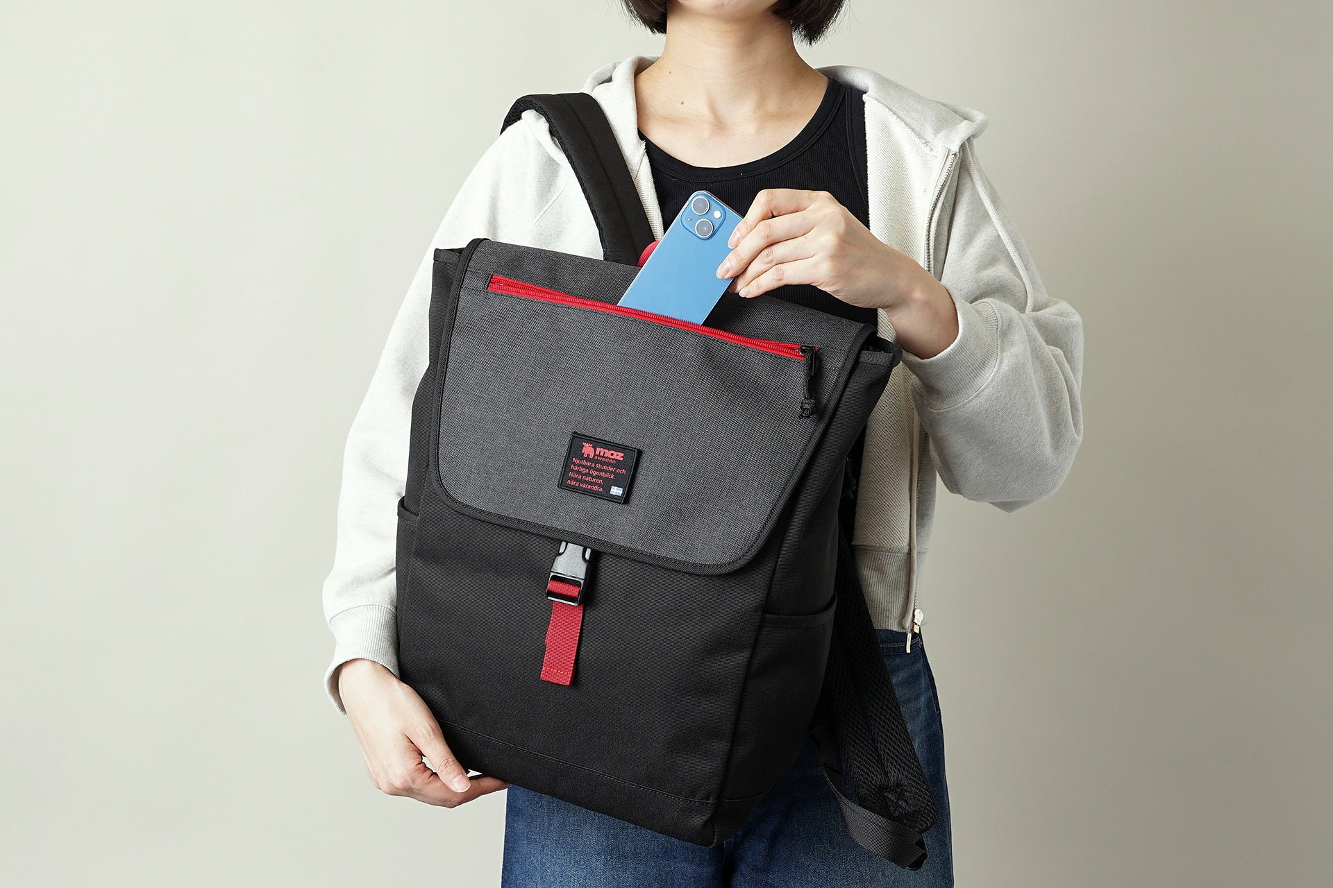 WEB限定カラーだけの特別な仕様として、利便性を追求したファスナー付きフロントポケットを搭載しました。スマホや小物をスマートに収納ができます。