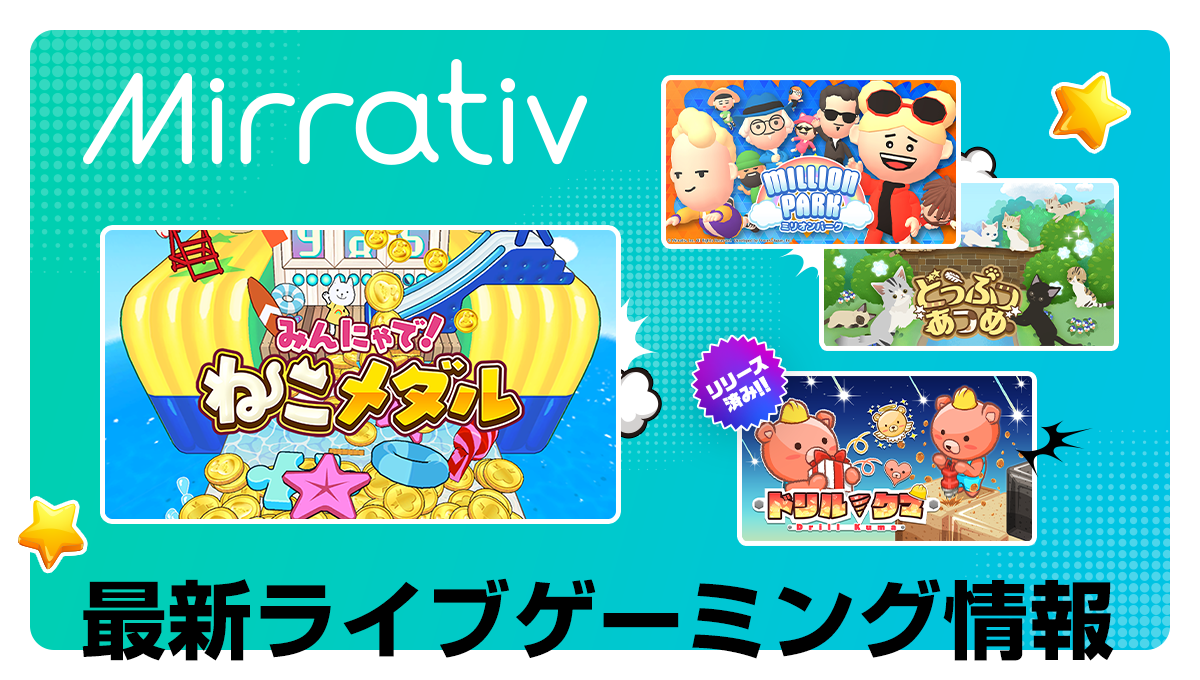 スマホゲーム配信者数で日本最大級のゲーム配信プラットフォーム「Mirrativ(ミラティブ)」(以下Mirrativ)を運営する株式会社ミラティブ(本社:東京都目黒区 代表取締役:赤川隼一)から、2022年9月2日(金)に先行リリースした「みんにゃで!ねこメダル」の最新情報や魅力をお届けします!さらに、近日リリース予定の新作タイトル「ミリオンパーク」「どうぶつあつめ」の紹介など、最新のライブゲーミング情報をお届けします。