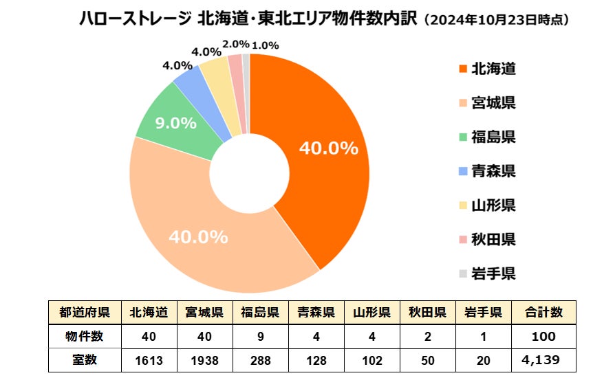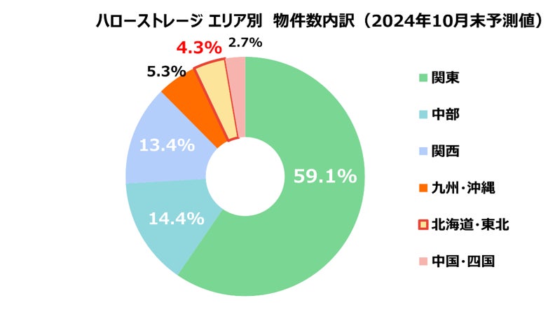「ハローストレージ」の出店数は、昨年の9月に出店室数が10万室を突破し、昨年10月には全国47都道府県の出店を達成しました。100件突破した北海道・東北エリアでは、主に北海道、宮城県を中心として出店しています。