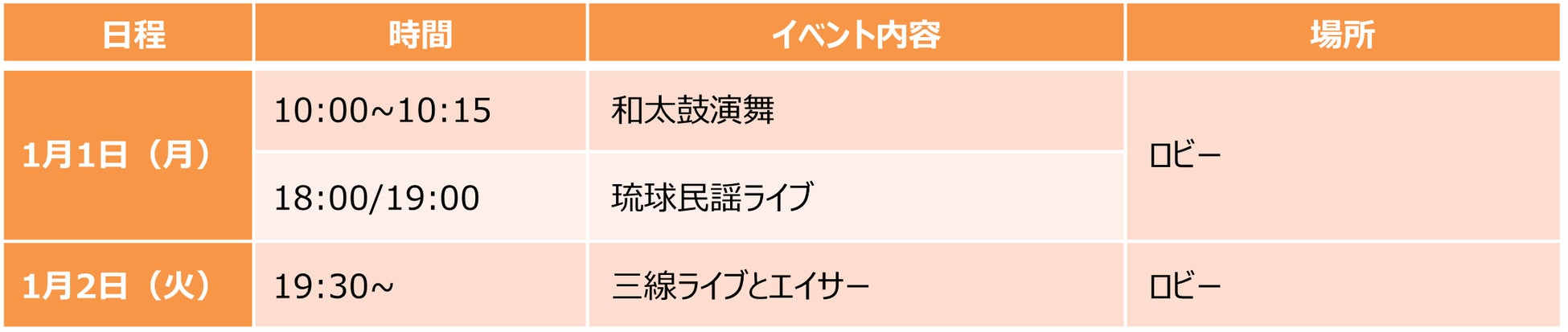 3日(水)には沖縄の伝統芸能「エイサー」や沖縄の伝統的な楽器である三線のライブといった華やかなイベントの数々で新年をお祝いいたします。