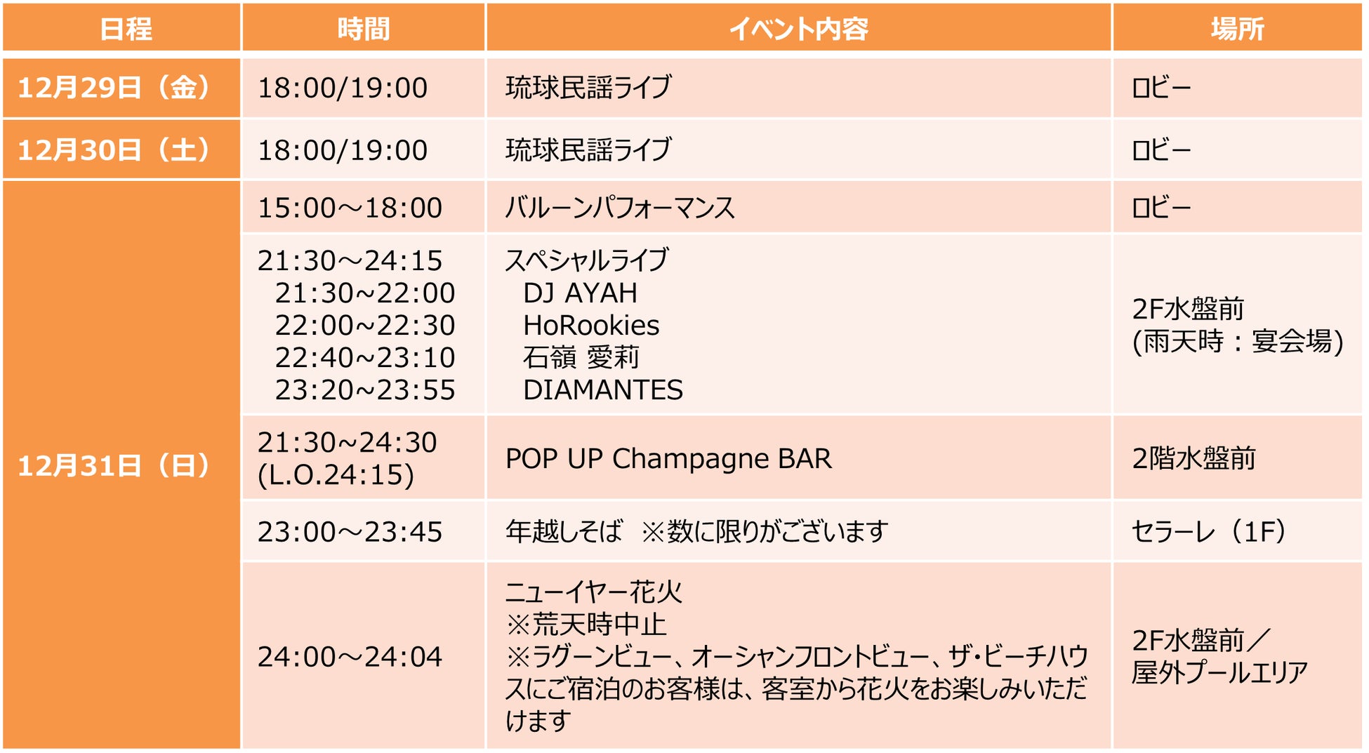 12月29日(金)と12月30日(土)には琉球民謡ライブ、 12月31日(日)にはバルーンパフォーマンスや年越しそば、 POP UP Champagne BARなどをご用意しております。さらには1年の締めくくりとして、4組のDJ/アーティストが特別なライブパフォーマンスを行った後に、華やかなニューイヤー花火とともに、新年の始まりをお祝いいたします。