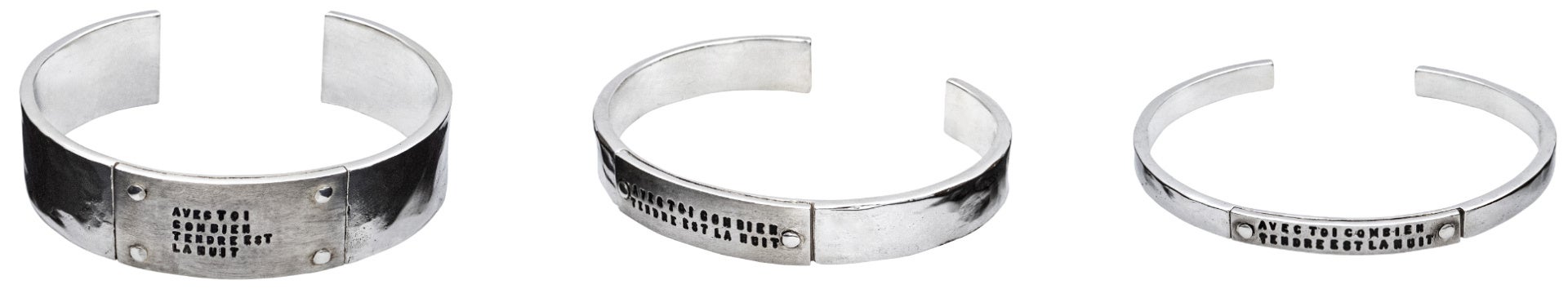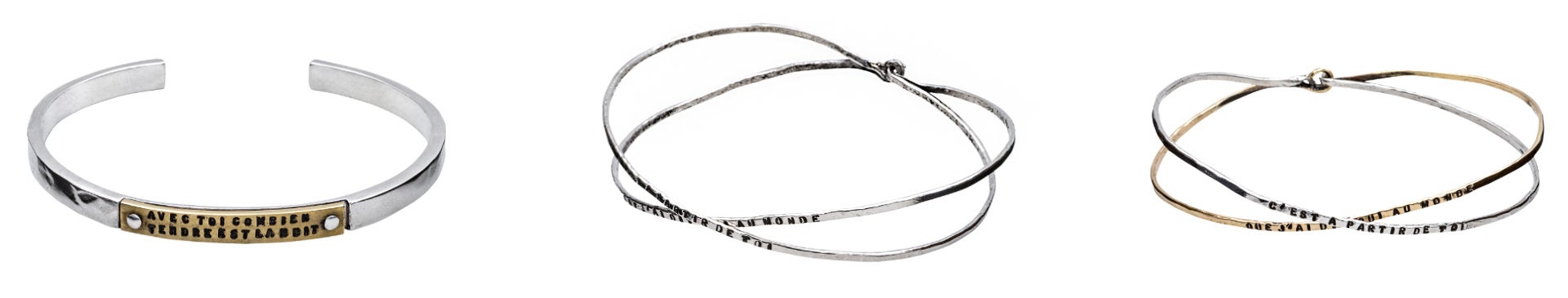 パリのジュエリーブランド「セルジュ・トラヴァル」は、デザイナー自身が綴った想いや、フランスの有名な小説『シラノ・ド・ベルジュラック』に登場する詩などをメタルに刻印する、力強いデザインが特徴です。一点一点、職人が感覚のままメタルを打つことで仕上げられていく、唯一無二のハンドメイドジュエリー。メッセージや想いが宿されたジュエリーたちは、一度身に着けると外せないタトゥーのように、しっくりと肌に馴染みます。