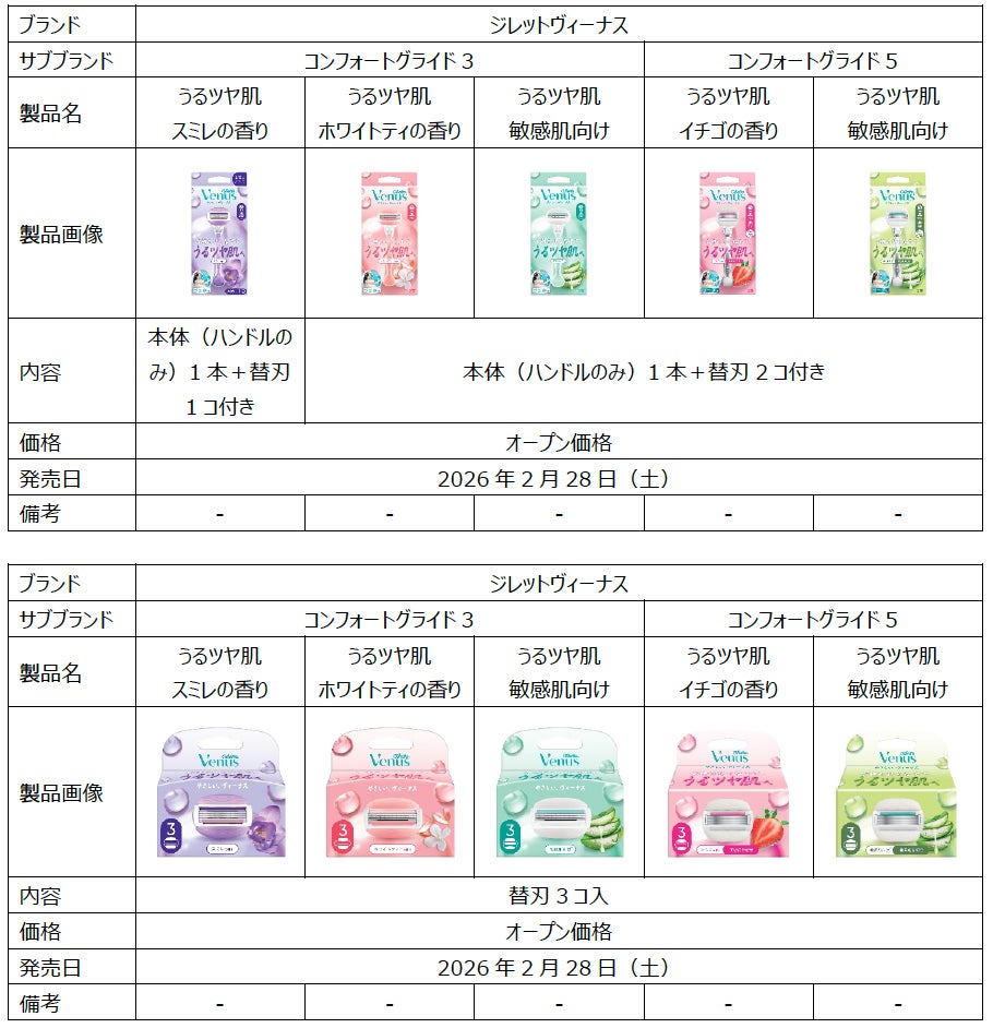 P&Gジャパン合同会社(本社:神戸市)は、売上世界No.1*1 女性用カミソリブランド「ジレットヴィーナス」から、2年ぶりとなるジェル・ソープ付きカミソリ『コンフォートグライド』シリーズの大型アップデートをいたします。現行製品のアップデートに加え、待望の敏感肌向けモデルを3枚刃/5枚刃でそれぞれ新発売いたします。2026年2月下旬より全国で発売いたします。