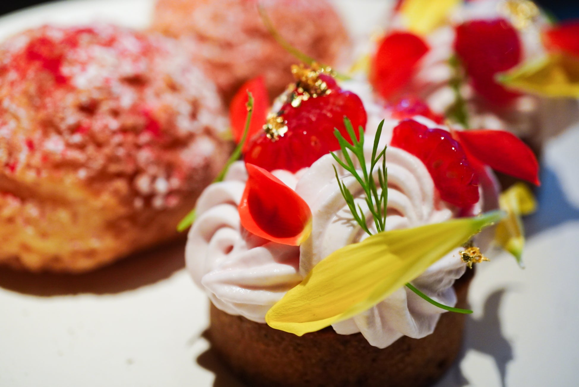 「 “花束”ではなく、“食べられるお花のプレゼント”」をテーマに、薔薇と苺のジャムを加えたカスタードクリームをたっぷり使用した、鮮やかなピンク色のシュークリームです。豊かな薔薇の香りと苺の酸味は、オーガニックのバニラと砂糖を使ったやさしい甘さが特徴のカスタードクリームと相性ぴったりです。また、フレッシュな苺をクリームに入れ、食感も楽しめる華やかな味わいに仕上げました。
