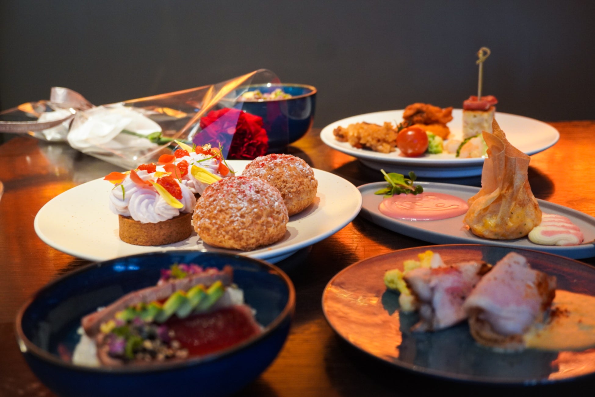 目玉となるのは、テーブルサービスでご用意する「オマール海老、ホタテ貝のパートフィロ」です。旨味たっぷりの贅沢な食材をサクサクのパイ生地で包み、焼き上げました。ビーツを使用した鮮やかなピンク色のソースと、添えられたマッシュポテトの薔薇で母の日らしく彩り豊かに仕立てています。さらに当ブッフェでは、北海道産のいくらや、ホテルオリジナルの濃厚ビーフカレー、女性に大人気のマグロポキなど贅沢なご飯のお供を豊富に取り揃えており、またお米には京都の老舗八代目儀兵衛のブレンド米を使用しています。カスタマイズしてお作りいただける自分だけの丼をお楽しみください。そのほか、母の日仕様に装飾された華やかなブッフェカウンターには和洋さまざまな料理に加え、七輪で焼き上げる焼肉カウンターや目の前で茹で上げるパスタなどライブ感のあるパフォーマンスコーナーが並びます。お好きなものをお好きなだけご堪能ください。デザートには、苺のゼリーとバラ風味のホイップが乗った花束のような「母の日タルト」もお楽しみいただけます。