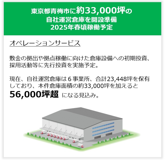 本件倉庫の開設により、自社運営倉庫面積は合計56,000坪超となる見込みです。