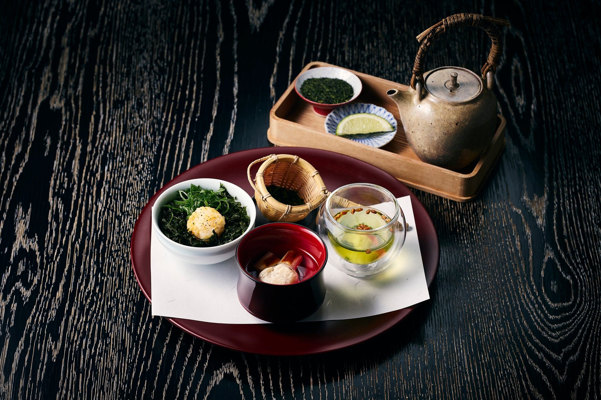 コースは山本山の最高級海苔「にほんばし」を使用した一品から始まります。続いて、お茶と海苔に季節のエッセンスを織り交ぜた五感で楽しむ一皿。そして、日本料理ならではの美食である「すっぽん」の力強く深い味わいの醍醐味と、季節の握り8貫で〆る鮨会席。お茶と海苔の香りと旨みを多彩な魅力と共に『山本山 嘉兵衛』謹製の食体験を提供いたします。料理のお供には、お茶と海苔を使った料理との相性を基準に厳選した日本酒やワインなどもご用意しています。