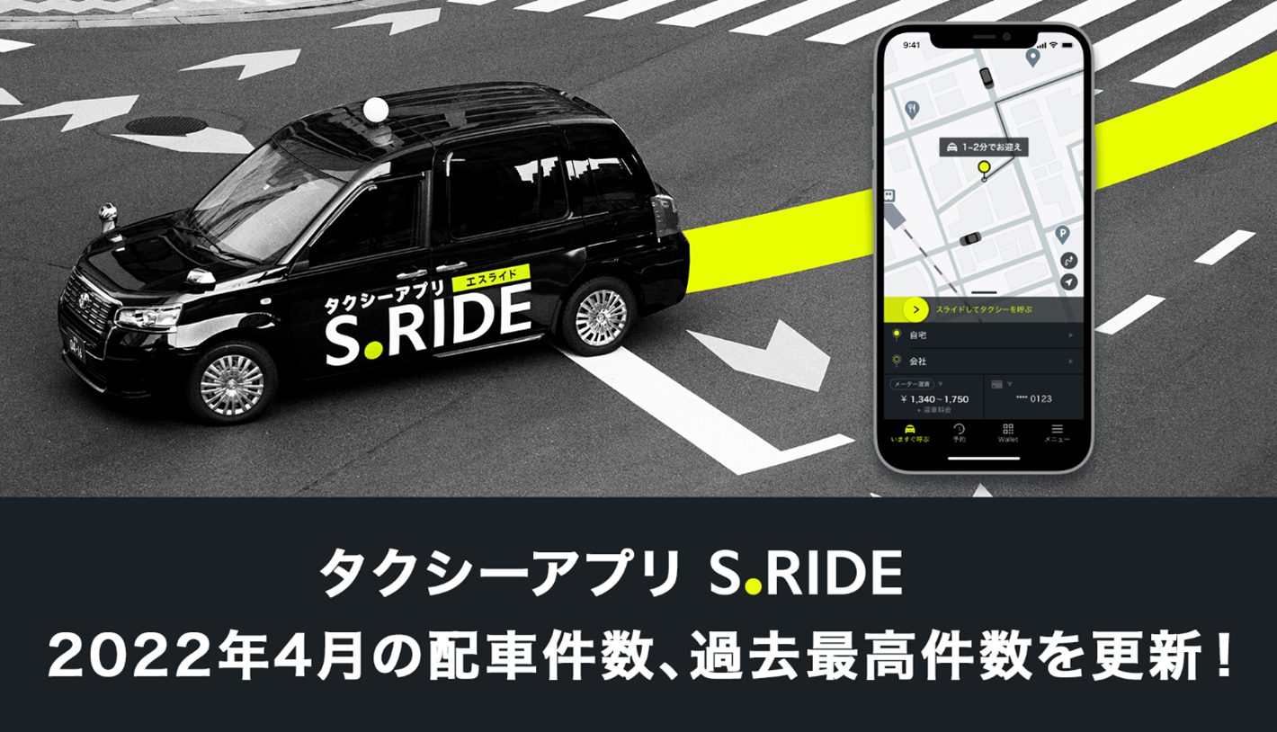 S.RIDE株式会社(本社:東京都台東区、代表取締役:西浦賢治、以下、S.RIDE)は、2022年4月に、タクシーアプリ“S.RIDE”の月間配車件数※が過去最高件数を更新したことをお知らせします。