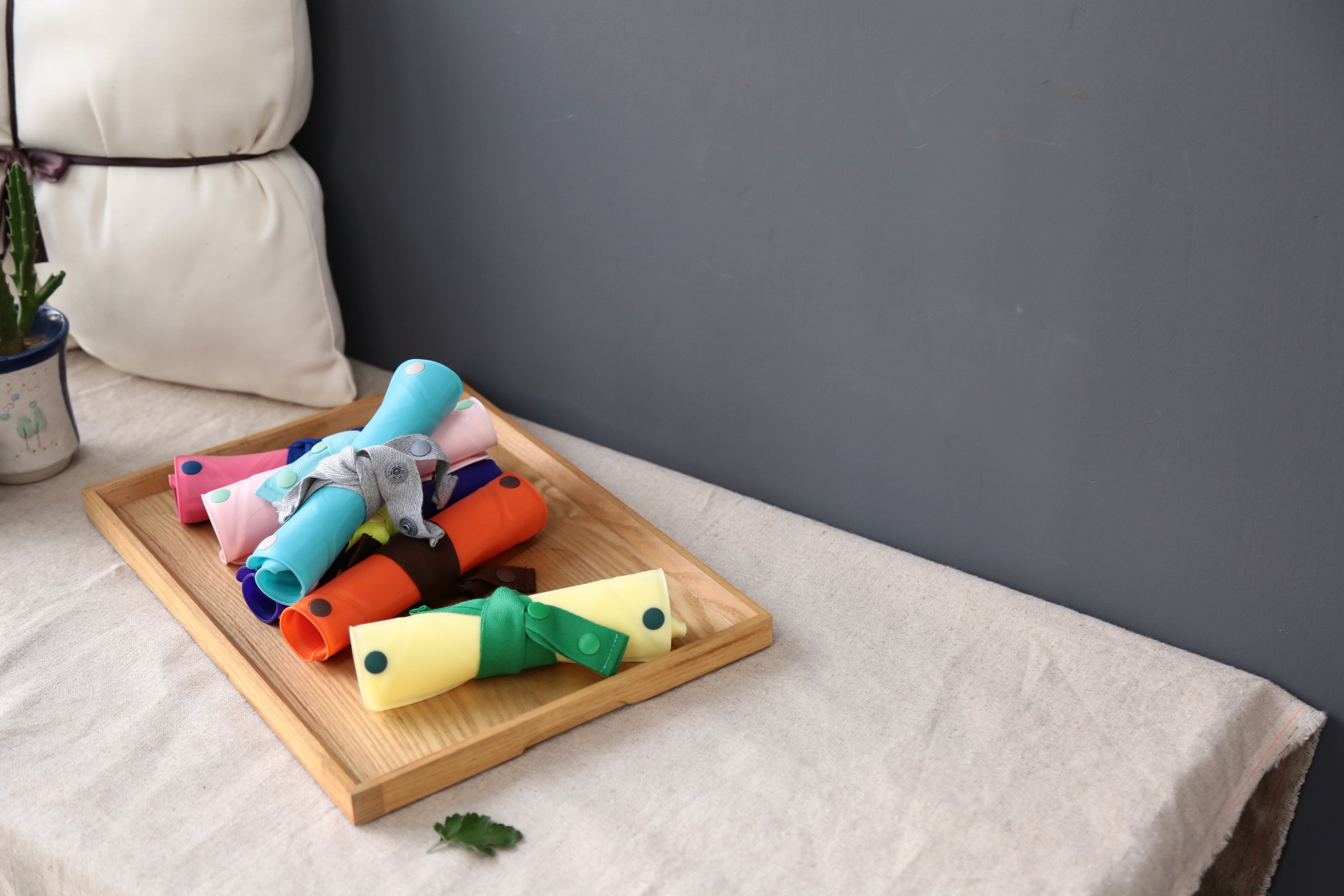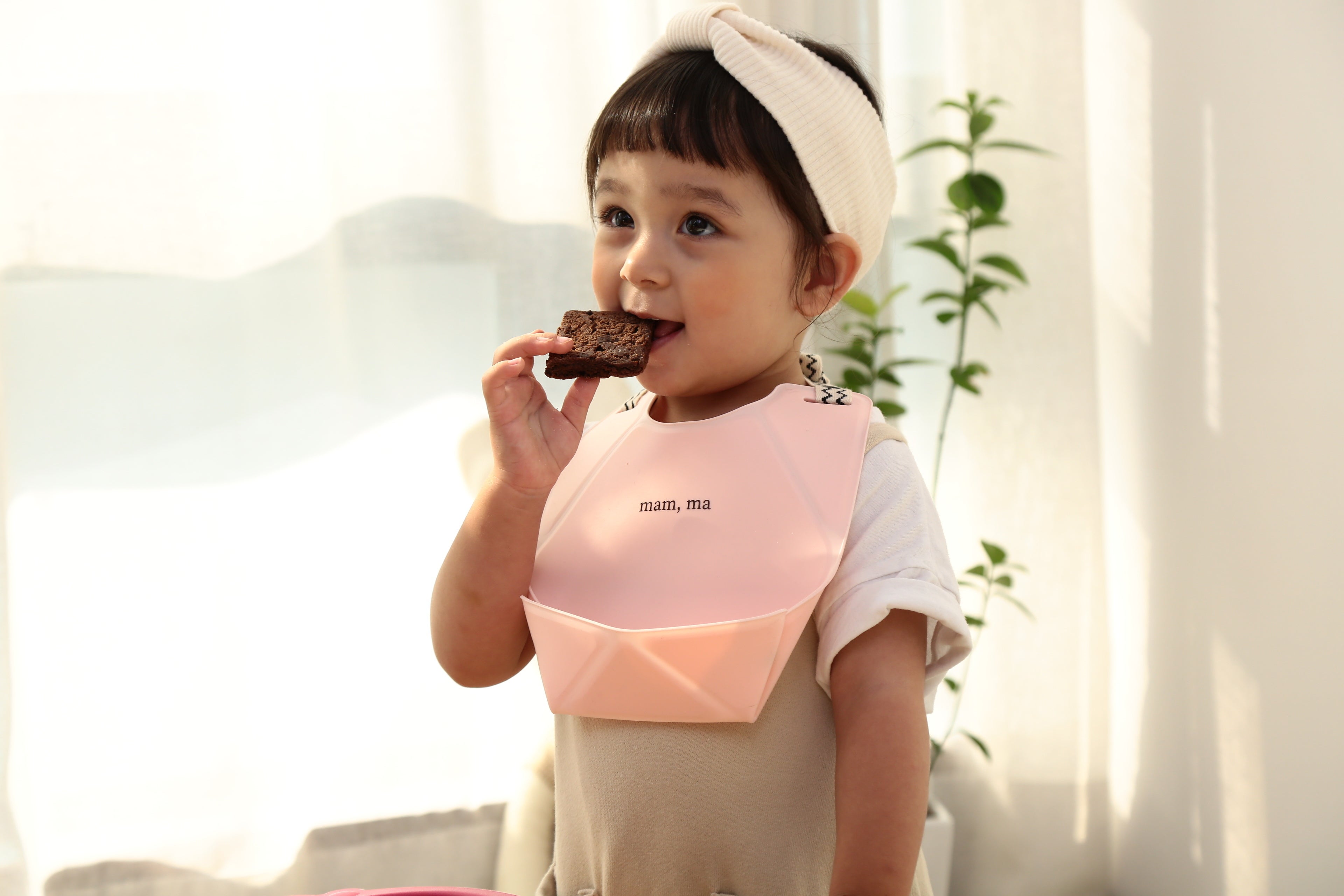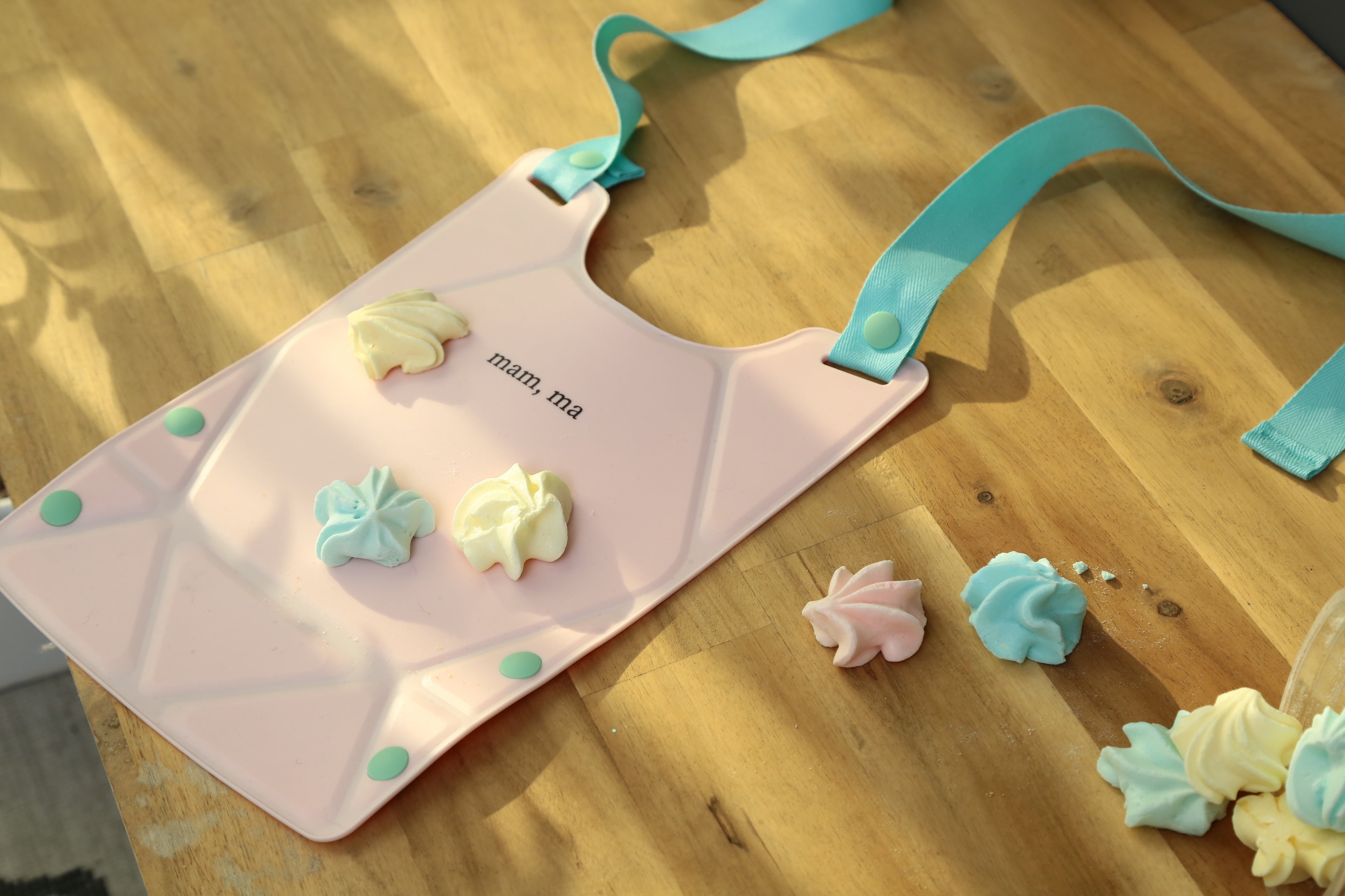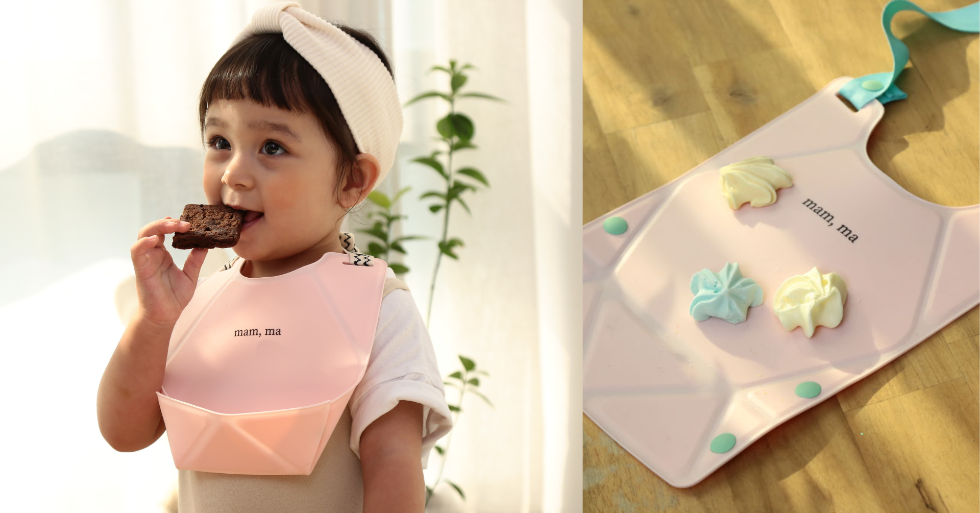 韓国で商品展開をはじめた翌年の2022年には台湾でも評判になり、今年は日本と上海での展開をスタート。日本で第一弾商品としてお届けするのは「ORIORIシリコーンビブ」。折り紙を折るようにシリコーンのシートのボタンを留めるとポケットの形状になります。コットンの紐を首の後ろで結んであげる、その一手間に惹かれました。