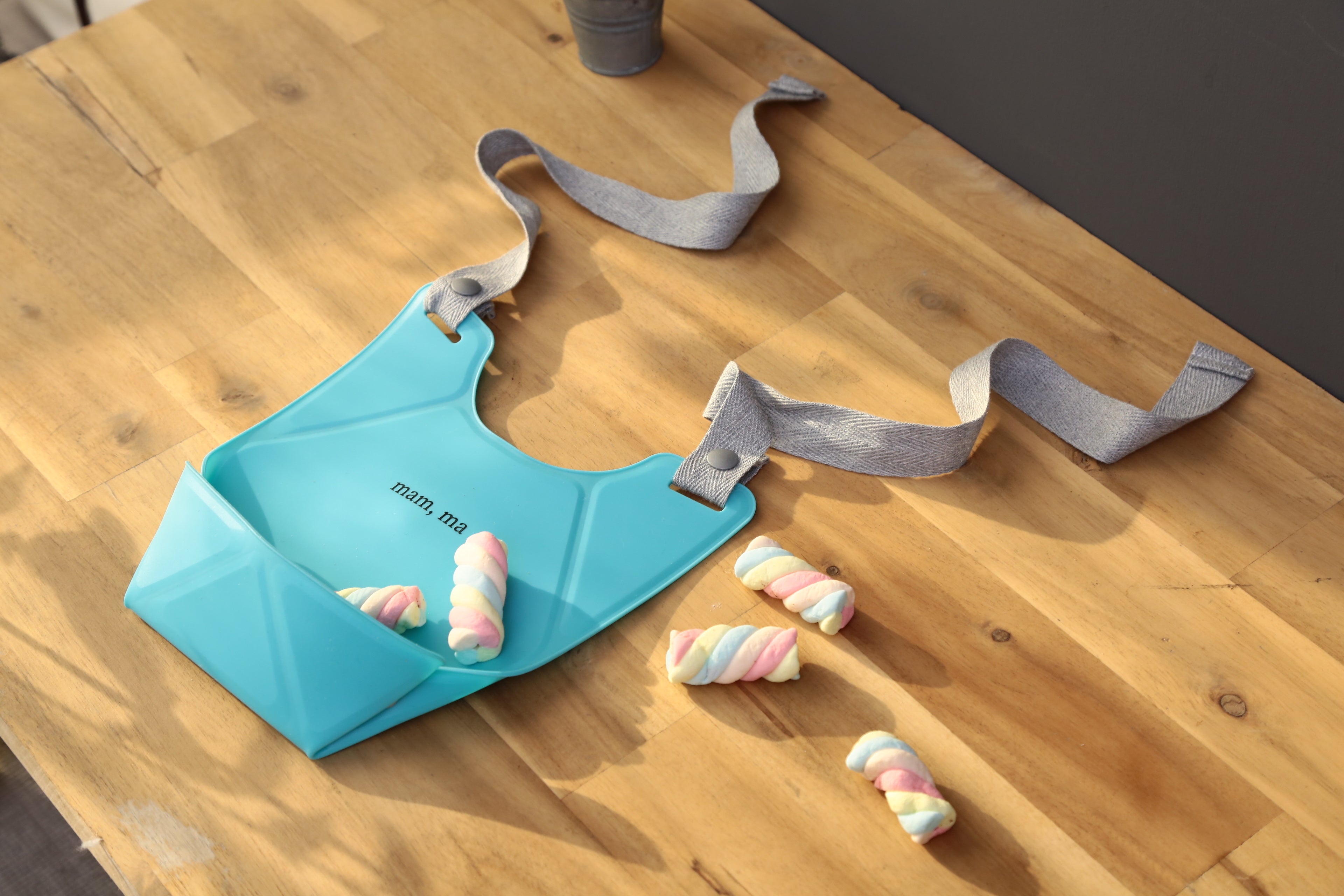 ビブの紐は、軽く、優しい肌ざわりのコットン素材。ビブ本体をくるりと丸めて紐を結べば、コンパクトにまとまります。