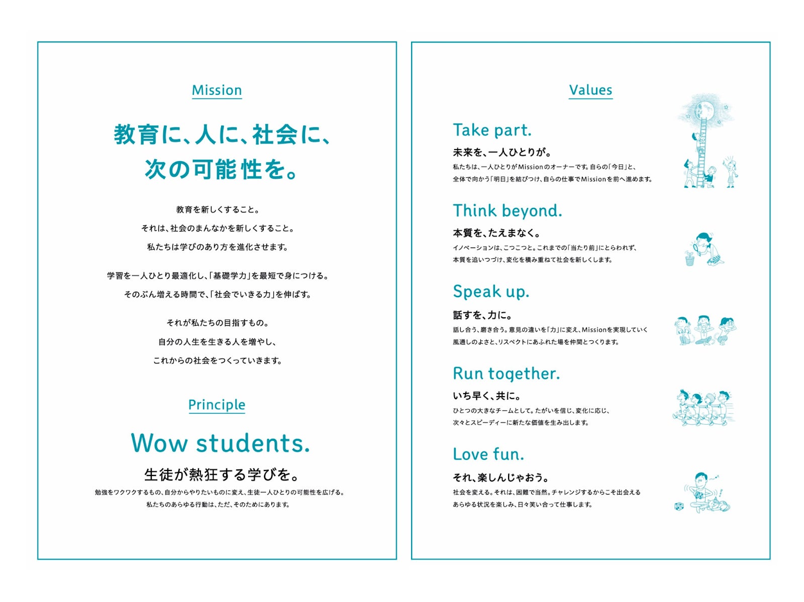 「教育に、人に、社会に、次の可能性を。」をミッションに、テクノロジーを活用して「基礎学力」の習得にかかる時間を短くし、「社会でいきる力」を養う時間を増やすことを目指しています。現在は、教育を一人ひとりに最適化するAI教材「atama+」を全国の塾・予備校3,300教室以上(2023年1月現在)に提供しています。