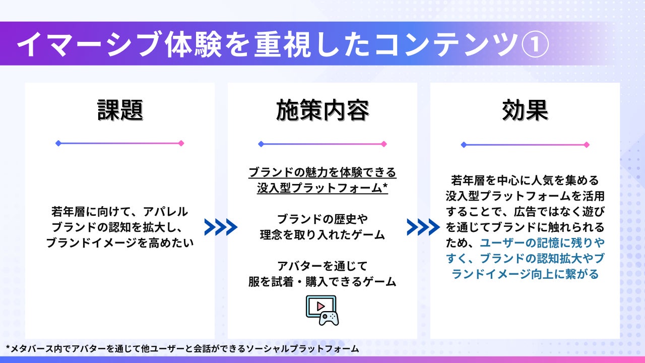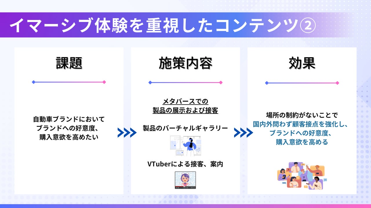 この強みを活かしたイマーシブコンテンツ制作の提供によって、顧客を魅了し、企業や商材のブランド価値を向上いたします。
