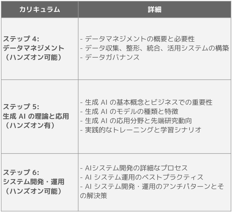 AIプロジェクトの推進方法やデータマネジメント、生成AIなどの最新のAI技術について深く学び、DX推進ツールを活用した実践的な事例を通じて、現場で即座に応用できるスキルを習得することを目指しています。