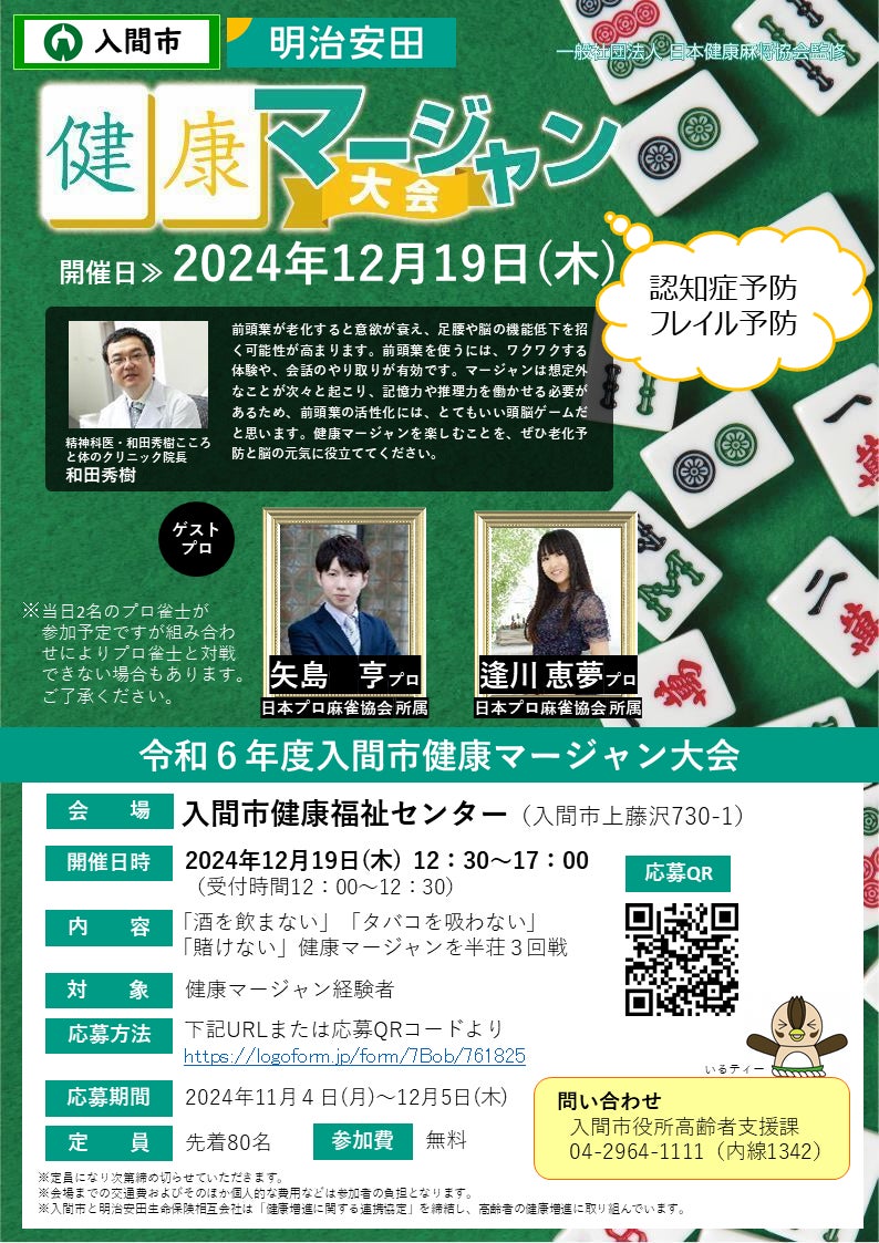 本イベントは「入間市と明治安田生命保険相互会社との健康増進に関する連携協定」に基づき共催・開催するもので、近隣市では初めての取組です。認知機能の向上や社会参画を促進する効果があるとされる健康マージャンのイベントにより、高齢者の健康増進を目指します。