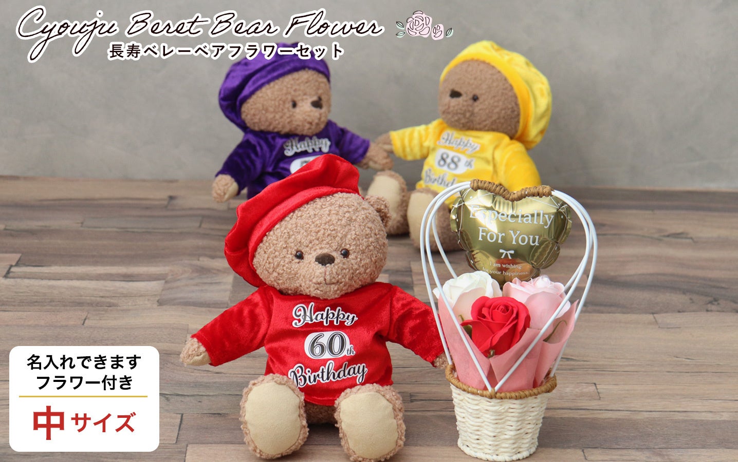 【セット内容】長寿ベア1体、専用ラグ、フラワーバスケット、専用ボックス(上から熨斗を巻いてお届け)