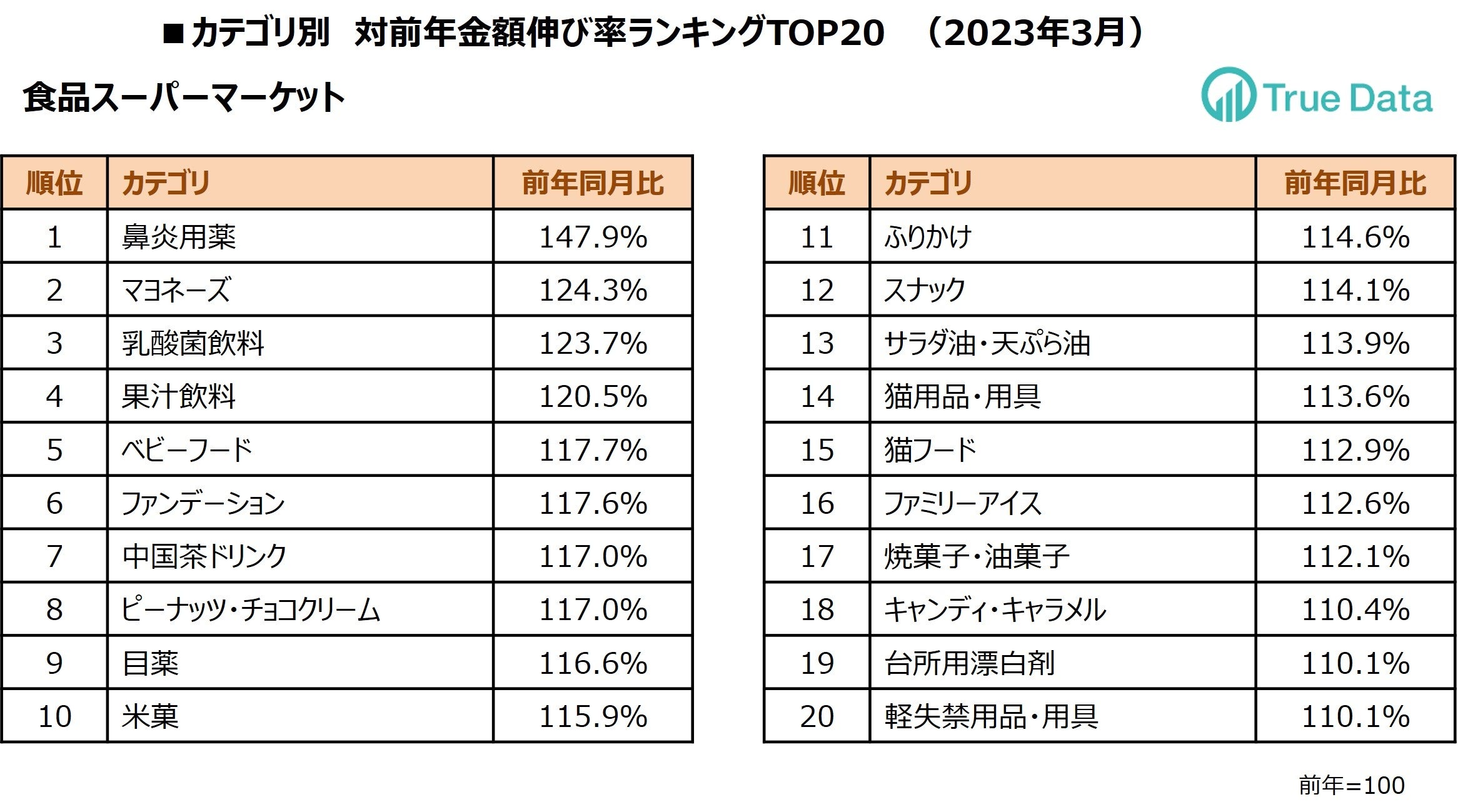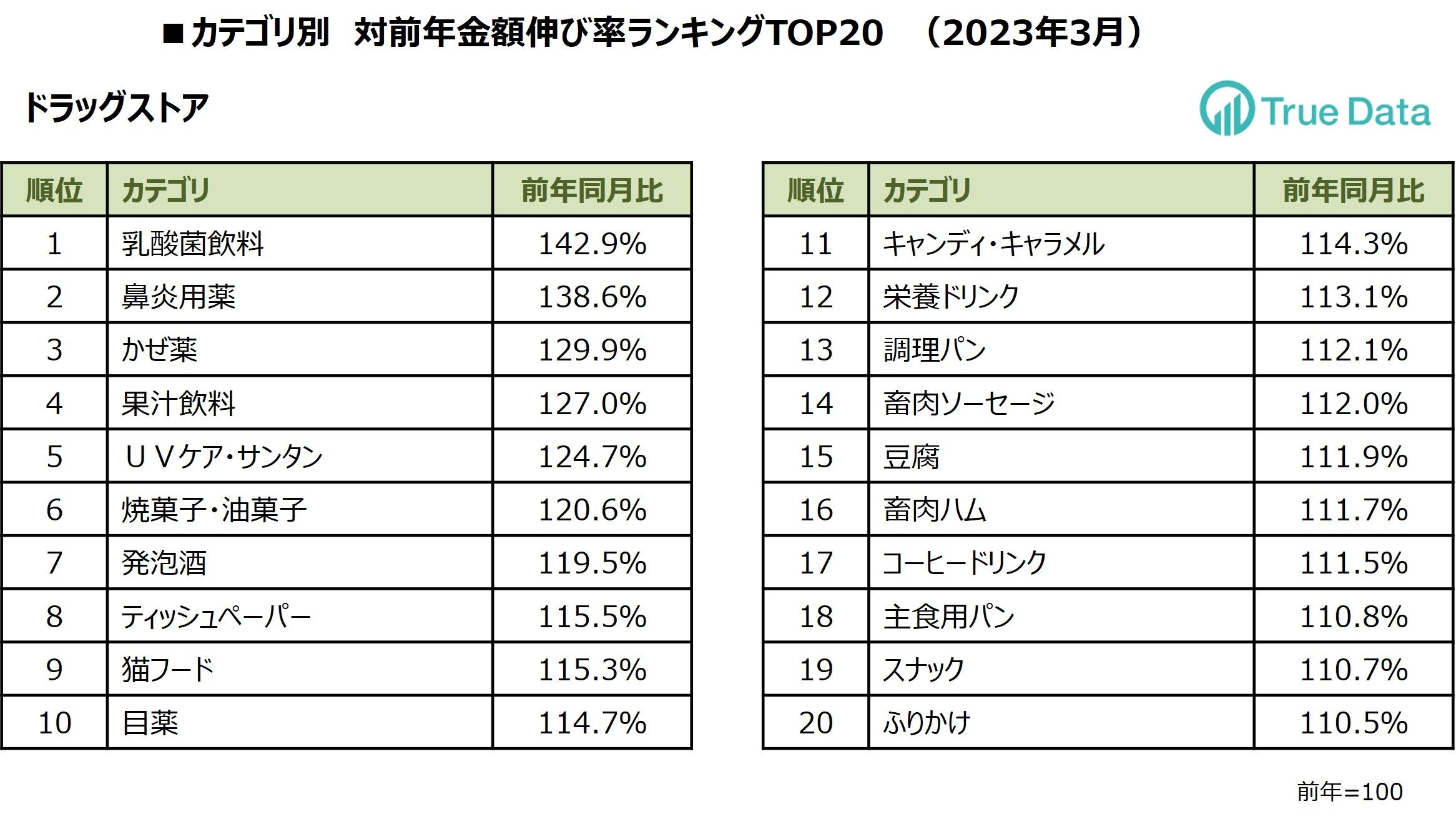 ~ドラッグストア、食品スーパーマーケット 2023年3月の対前年伸び率TOP20カテゴリを発表 ~