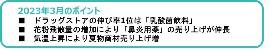 3月は北日本と東日本で記録的な暖かさだったことから、ドラッグストアでは暑さと売り上げの関係性が高い「果汁飲料」や、「UVケア・サンタン」、「発泡酒」の売り上げが伸長し、上位にランクインしました。