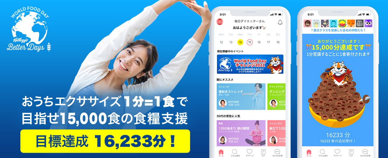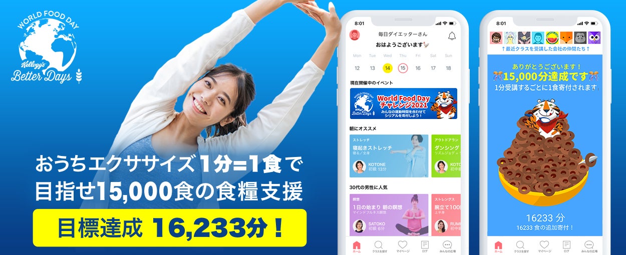 10月16日(土)の「世界食糧デー」にあわせ、10月14日(木)~11月14日(日)まで「ケロッグ World Food Day チャレンジ 2021」を実施しました。自宅からも参加できる新しい従業員ボランティアの取り組みとして、運動習慣化支援アプリ“Beatfit”を活用した「バーチャルボランティアプログラム」で、社員が行ったエクササイズ1分をシリアル1食分に換算し、目標の期間合計15,000食の寄付に対し、16,233食の寄付を達成し、子ども食堂への寄贈につなげることができました。
