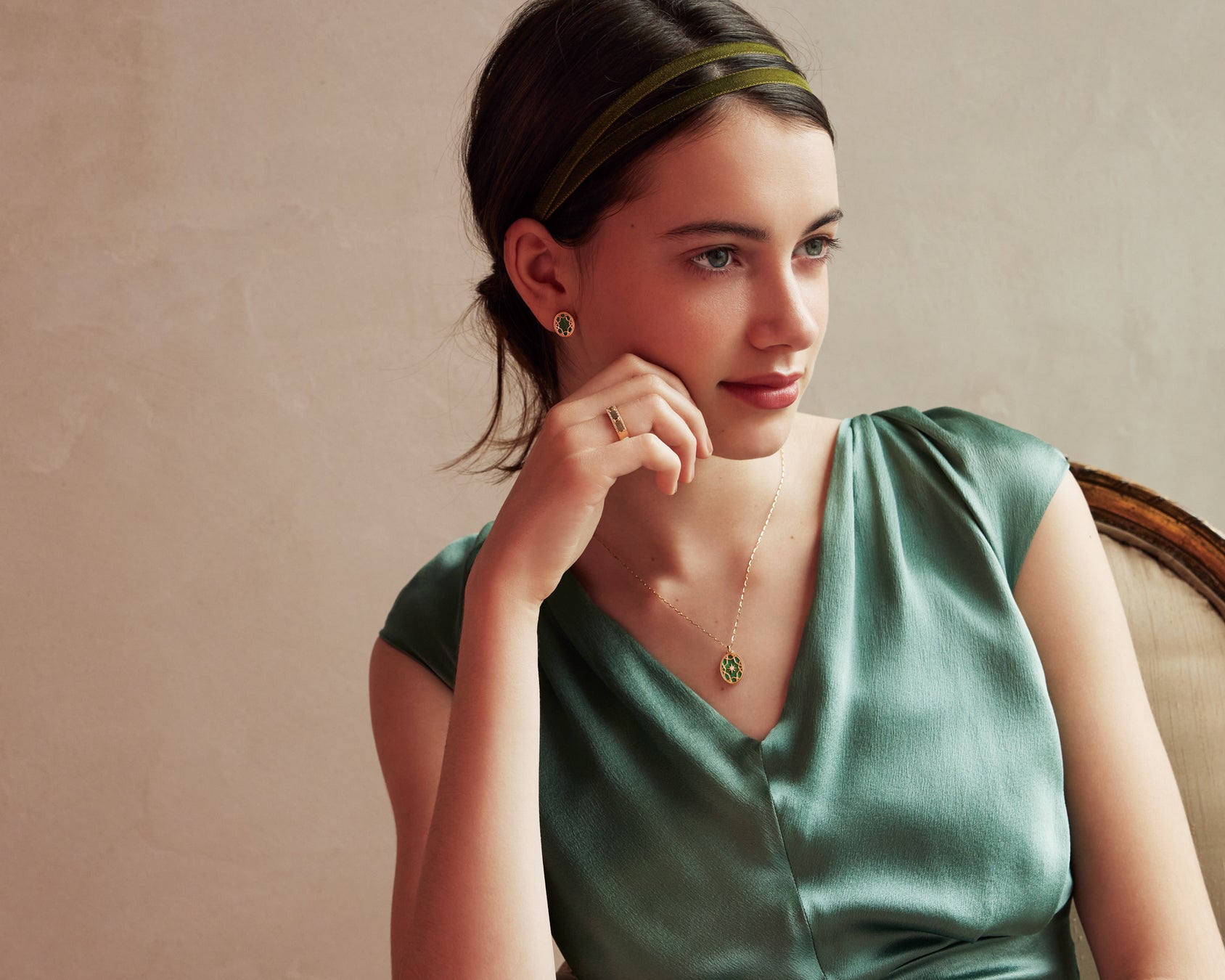 床や柱に使われた大理石の質感をマラカイトで表現したネックレスとピアスはアートのような美しさです。リングはフラットにカットされたペリドットとブラックシェルを、一つ一つの面を埋めるようにあしらい、 メレダイヤの繊細な煌めきで縁取りました。