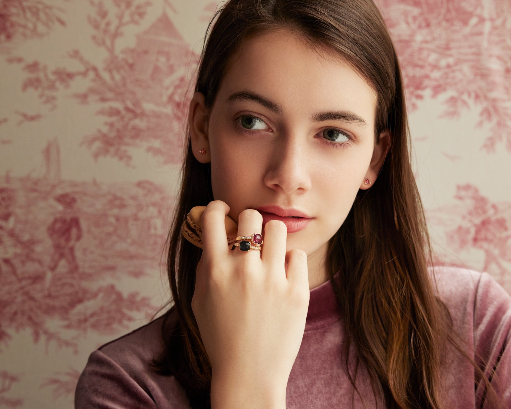 シュガーをまとったように繊細にきらめくダイヤモンドと、瑞々しい表情を演出するカラーストーンに映える地金のコントラストが印象的なデザイン。3通りの着け方が楽しめる魅力的なセットリングです。