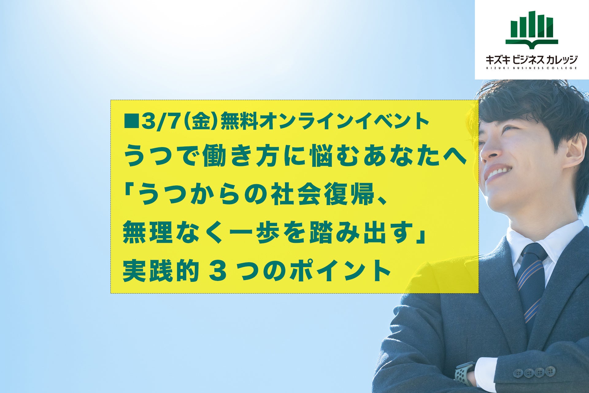 2025年3月7日(金)20時〜20時30分、就労移行支援事業所キズキビジネスカレッジは、「うつ病(うつ状態)で、これからの仕事や働き方に悩みがある方」に向けて、無料のオンラインイベントを実施します。