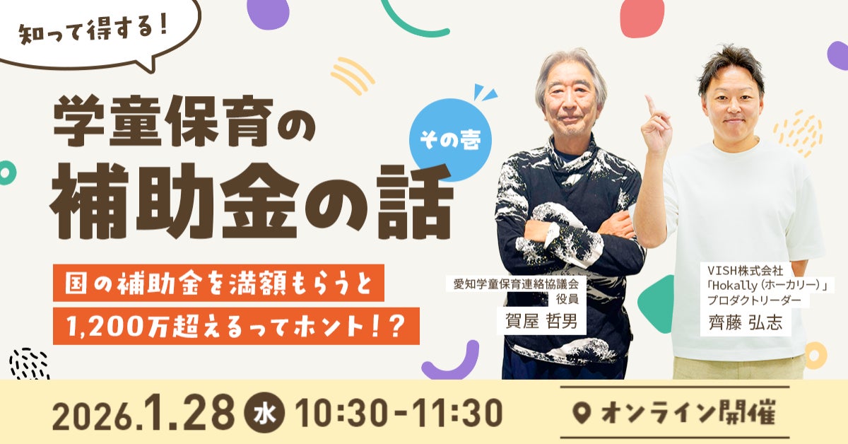 VISH株式会社(本社:愛知県名屋市、代表取締役社長:田淵 浩之)は、学童保育施設(放課後児童クラブ)を運営する経営者・施設長を対象とした無料オンラインセミナー「知って得する!学童保育の補助金の話 その壱 -国の補助金満額もらうと1,200万超えるってホント!?-」を2026年1月28日(水)に開催いたします。