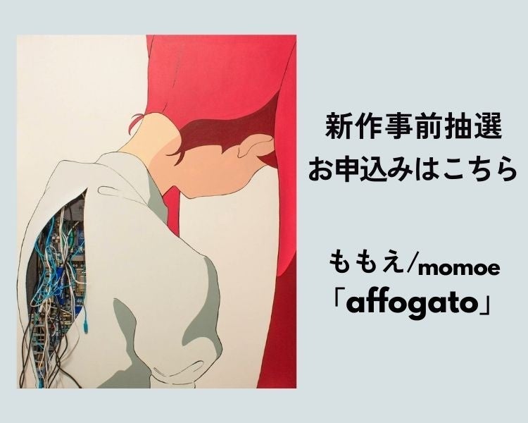 本展のタイトル「affogato」は、熱いエスプレッソと冷たいアイスが溶け合うことで新たな味を生むスイーツに由来します。ももえの作品もまた、「平面的なキャラクター」と「実在する物質」という異質な要素の融合によって、新鮮な視覚体験を生み出します。今回は、初挑戦となる100号キャンバスや毛糸を用いた新作など、多彩な表現を展開いたします。