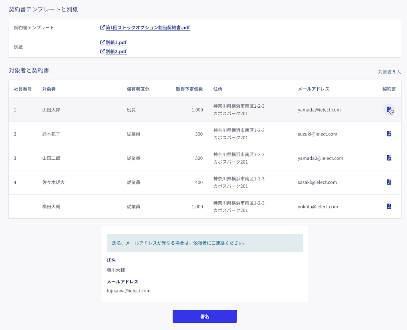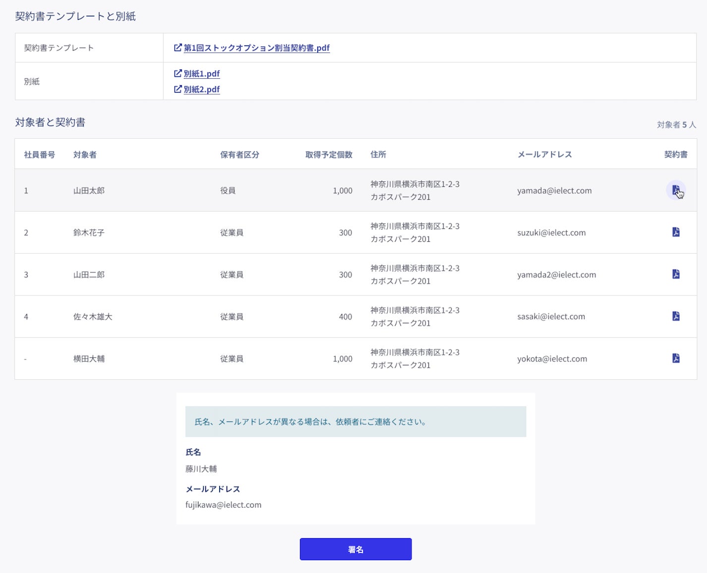 ストックオプション発行時は会社と役員や従業員との間で大量の契約作業を迅速に進行させる必要があります。SO電子契約機能では、あらかじめ登録したデータから契約書のテンプレートに対して氏名、住所、割当個数等の情報を一括で反映することができます。