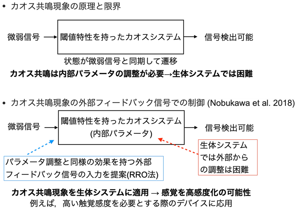 1. カオス共鳴: システム内部のカオス的な(不規則な)振る舞いを利用して、外部からの微弱な信号にタイミングを合わせ(同期し)、信号を増幅して検出する現象。