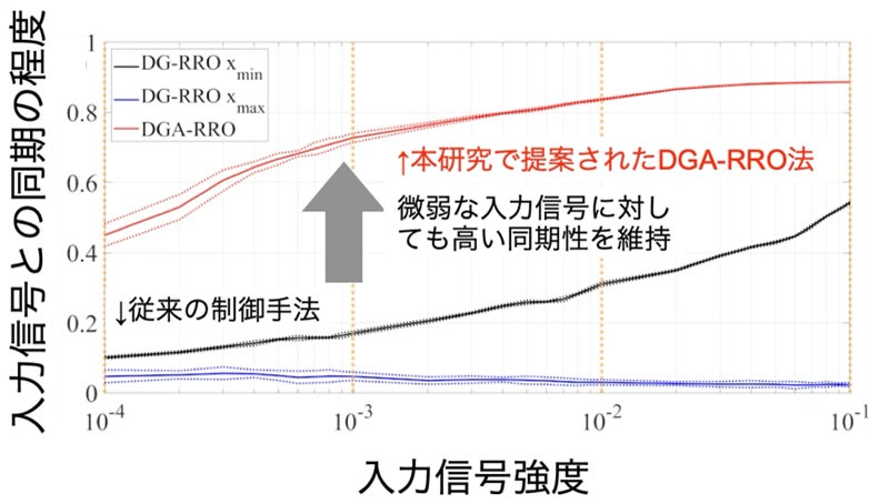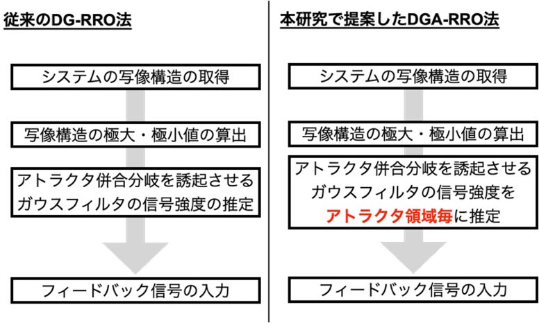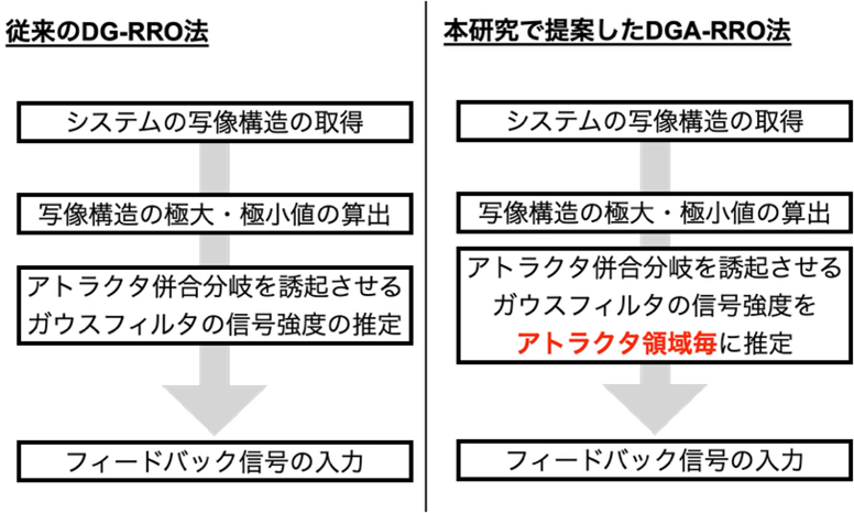 本研究チームは、システムの構造的な非対称性を補正し、カオス共鳴を最大化するための新しいフィードバック制御手法「DGA-RRO」を考案しました(下図)。