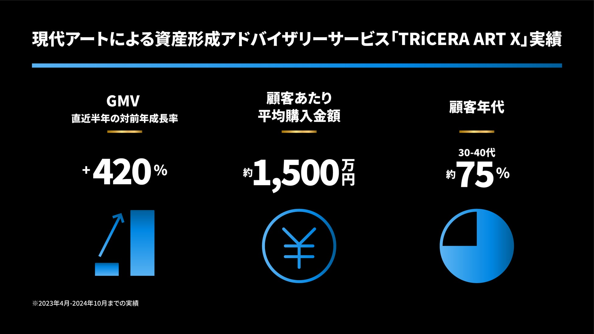 現代アートによる資産形成アドバイザリーサービス「TRiCERA ART X」は、不透明で分かりにくい価格を、適正価格で提示することで安心して売買ができるサービスです。TRiCERAが公平な取引を続けていくことで、「アートが健全な資産である」ことを示し、マーケットを拡大させていきます。このマーケットの拡大と資本の循環が生まれることで、アーティストの環境が整いキャリア形成へと繋がっていきます。このようにして、未来に繋がるアートが生み出される社会を創り上げることができると信じています。現代アートを所有することで満たされる喜びと、未来に繋がるアートが生み出される社会を創り上げることで、世の中を豊かにしていくことに挑み続けます。
