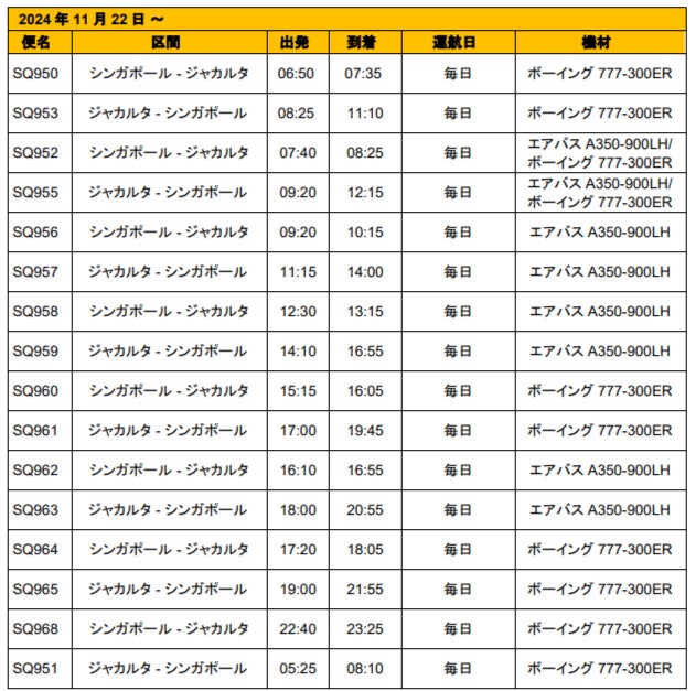2024年11月22日より、シンガポール航空はシンガポール - ジャカルタ間に1日2便(SQ952便、SQ955便およびSQ960便、SQ961便)を追加します。これにより、シンガポール - ジャカルタ間の直行便は現在の毎日6便から毎日8便となります。