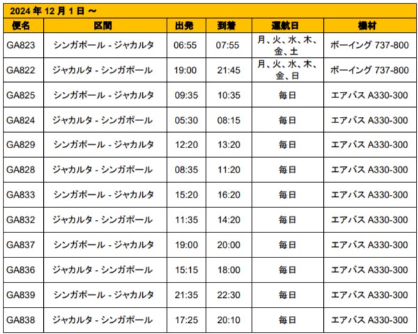 2024年12月1日より、ガルーダ・インドネシア航空はジャカルタ - シンガポール間に1日2便(GA825便、GA824便およびGA839便、GA838便)を追加します。これにより、ジャカルタ - シンガポール間の直行便は現在の毎日4便から毎日6便となります。