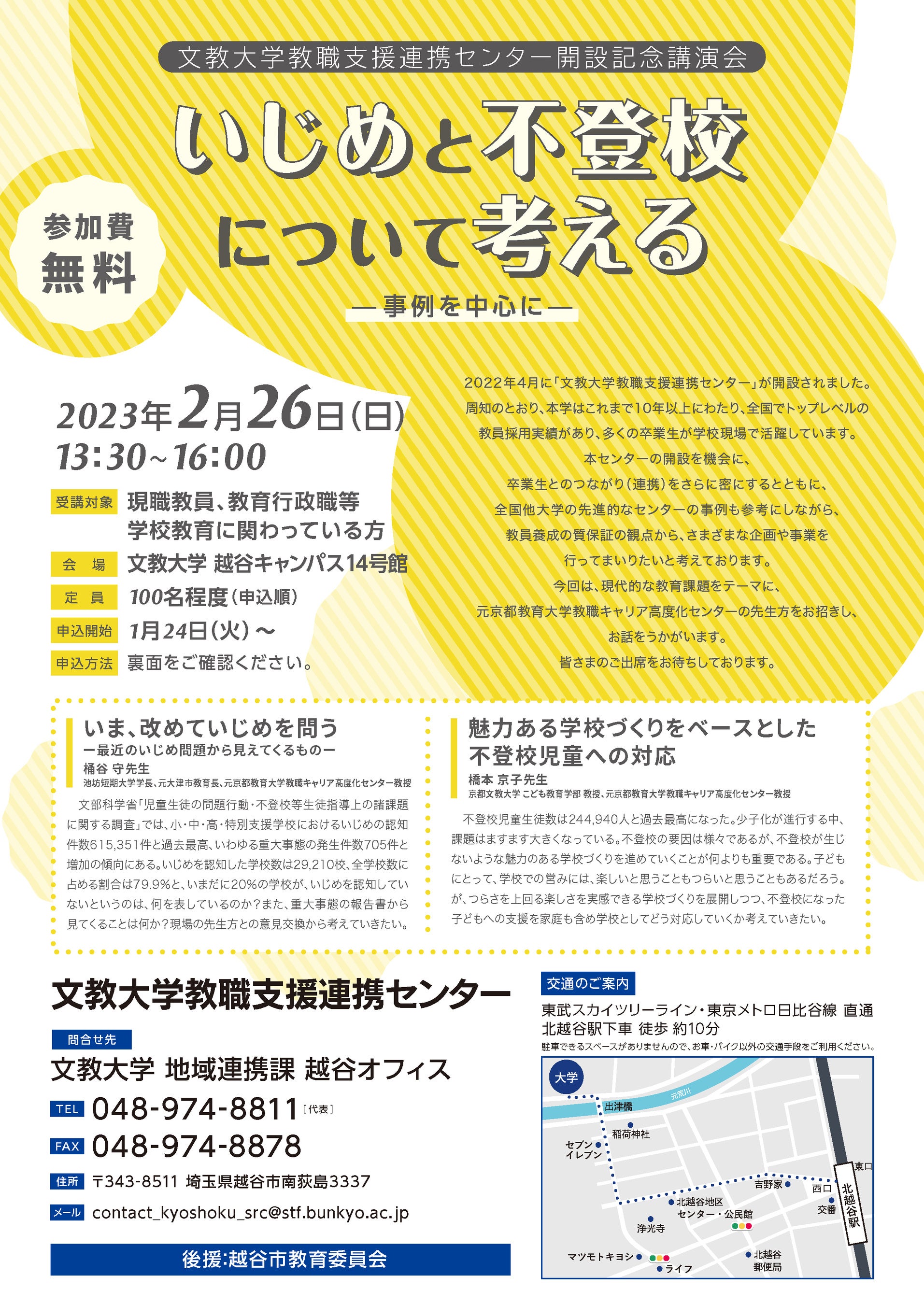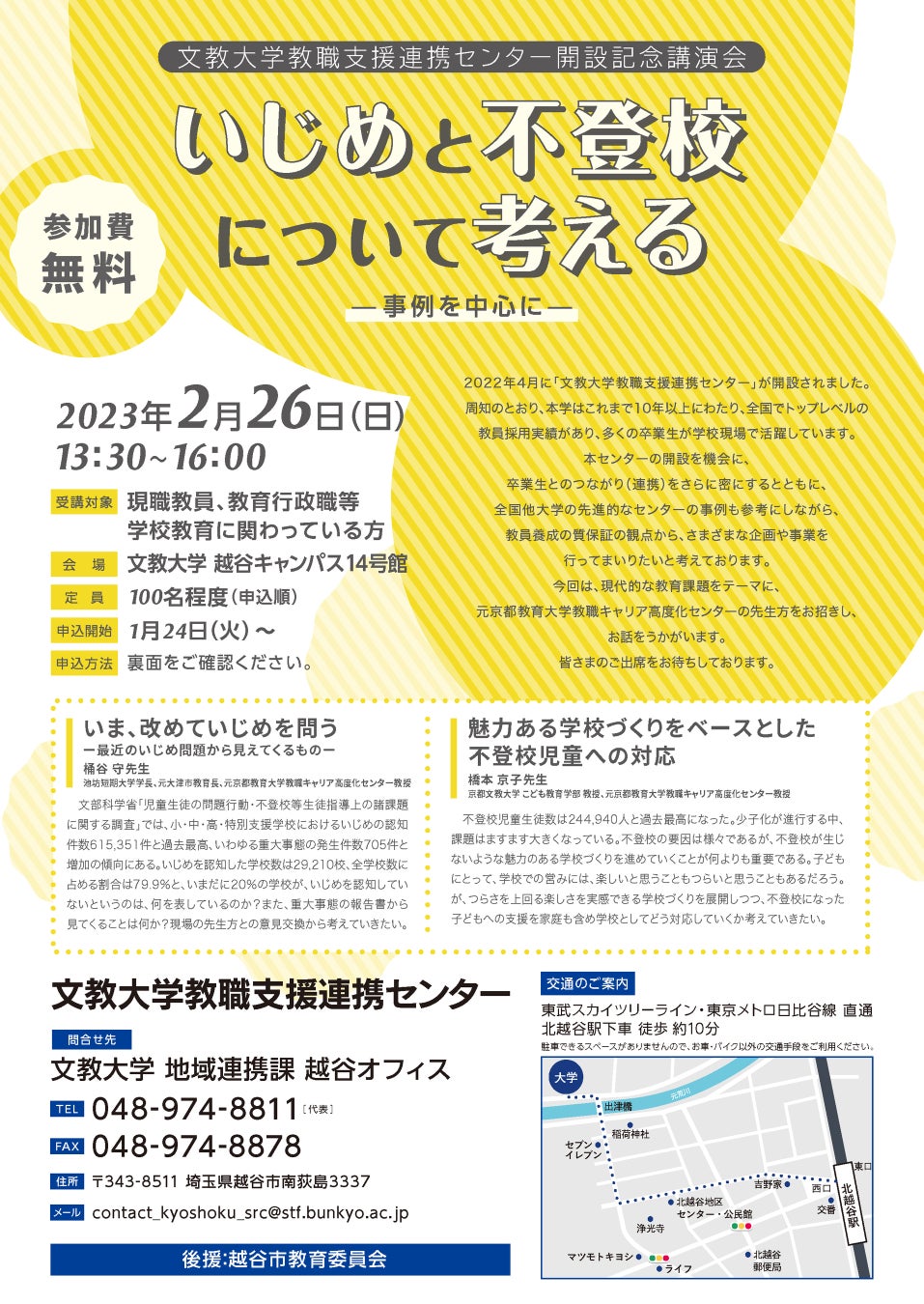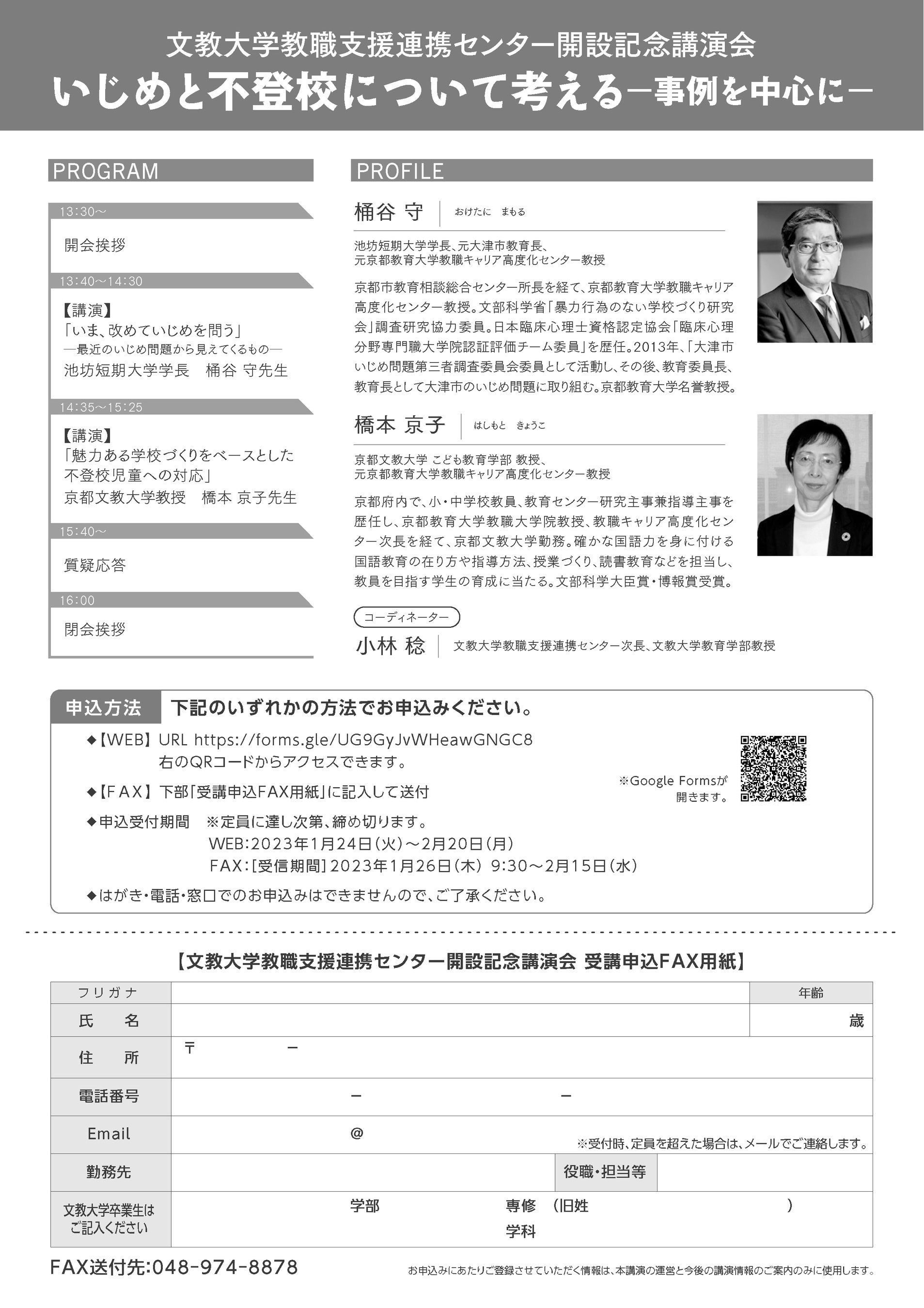 | 文教大学教職支援連携センター開設記念講演会「いじめと不登校について考える-事例を中心に-」 日 時 2月26日(日)13:30-16:00 会場・形式 文教大学越谷キャンパス 14号館(対面形式) 受講対象 現職教員、教育行政職等学校教育に関わっている方 定 員 100名程度(申込順) 受講料 無料 プログラム ・「いま、改めていじめを問う -最近のいじめ問題から見えてくるもの-」 講師:桶谷 守氏(池坊短期大学学長) ・「魅力ある学校づくりをベースとした不登校児童への対応」 講師:橋本 京子氏(京都文教大学) コーディネーター:小林 稔教授(文教大学教育学部) 申込方法 【WEB】 https://forms.gle/UG9GyJvWHeawGNGC8 【FAX】下部のチラシ「受講申込FAX用紙」に記入して送付 申込期間 【WEB】2023年1月24日(火)~2月20日(月) 【FAX】[受信期間]2023年1月26日(木) 9:30~2月15日(水) 問い合わせ 文教大学地域連携課 越谷オフィス 電話番号:048-974-8811(代表) FAX:048-974-8878 メール:contact_kyoshoku_src@stf.bunkyo.ac.jp その他 はがき・電話・窓口ではお申込みできませんので、ご了承ください。 桶谷 守氏 池坊短期大学学長、元大津市教育長、元京都教育大学教職キャリア高度化センター教授 文部科学省「児童生徒の問題行動・不登校等生徒指導上の諸課題に関する調査」では、小・中・高・特別支援学校におけるいじめの認知件数615,351件と過去最高、いわゆる重大事態の発生件数705件と増加の傾向にある。いじめを認知した学校数は29,210校、全学校数に占める割合は79.9%と、いまだに20%の学校が、いじめを認知していないというのは、何を表しているのか?また、重大事態の報告書から見てくることは何か?現場の先生方との意見交換から考えていきたい。 橋本 京子氏 京都文教大学 こども教育学部 教授、元京都教育大学教職キャリア高度化センター教授 不登校児童生徒数は244,940人と過去最高になった。少子化が進行する中、課題はますます大きくなっている。不登校の要因は様々であるが、不登校が生じないような魅力のある学校づくりを進めていくことが何よりも重要である。子どもにとって、学校での営みには、楽しいと思うこともつらいと思うこともあるだろうが、つらさを上回る楽しさを実感できる学校づくりを展開しつつ、不登校になった子どもへの支援を家庭も含め学校としてどう対応していくか考えていきたい。 |