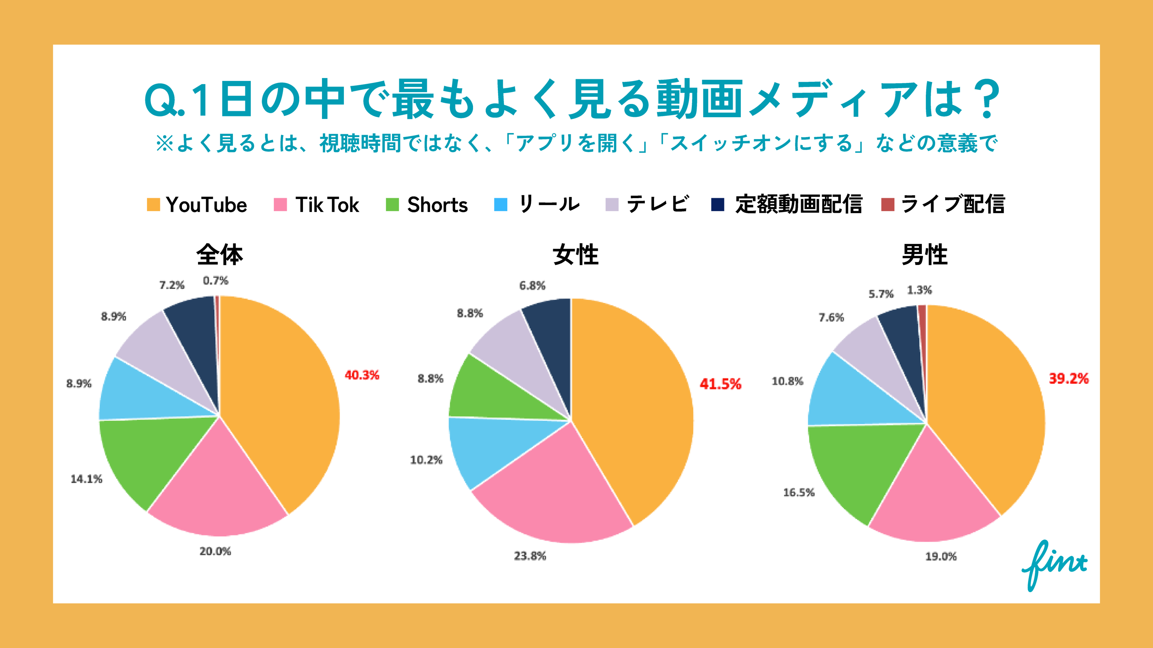また全体・男性の3位が【YouTube Shorts】に対し、女性3位は【Instagram リール】となっている。Q1の結果からもわかるように、女性はYouTubeは頻度高く見る一方で、YouTube Shortsを見ることは比較的少ない結果に。